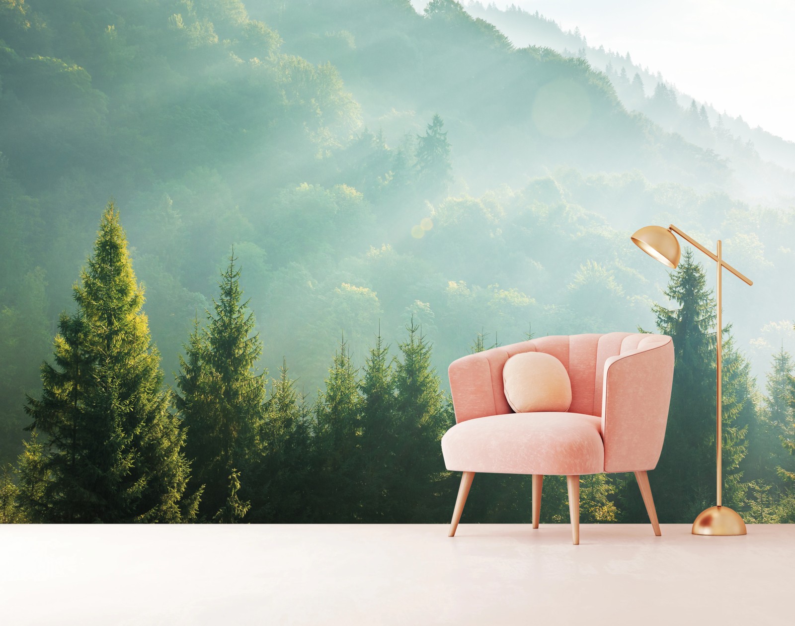 Fototapete Neblige fichtenspitzen im morgenlicht