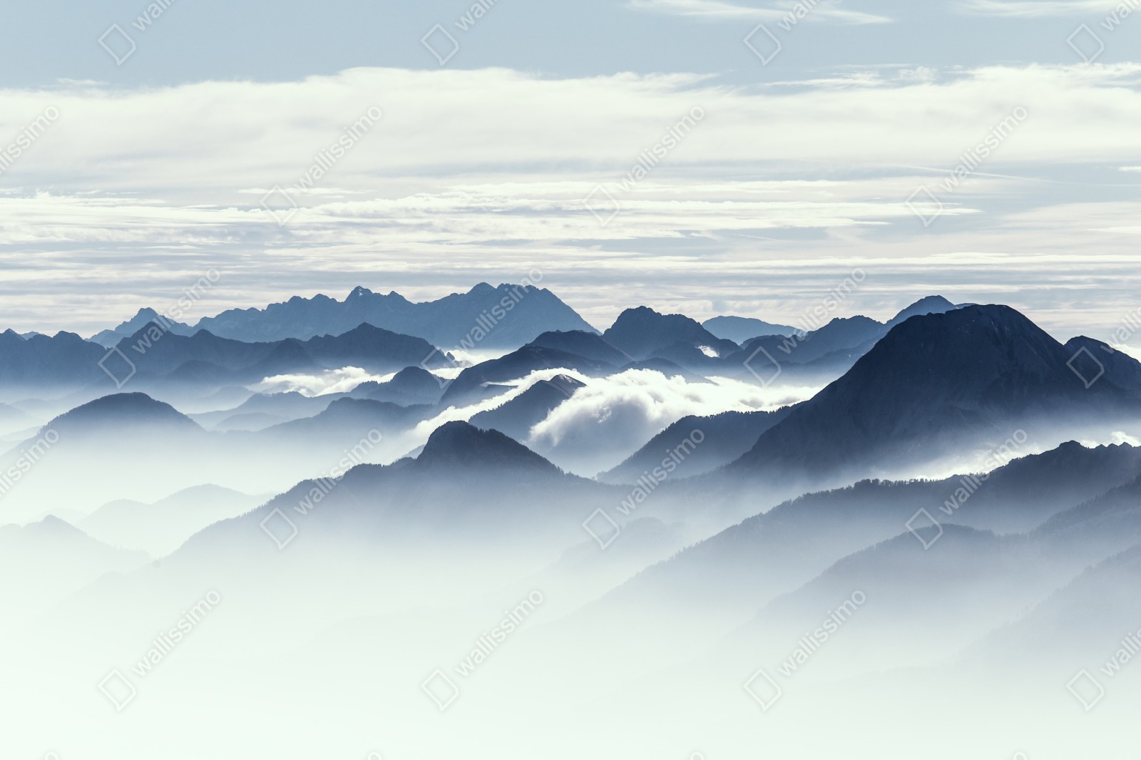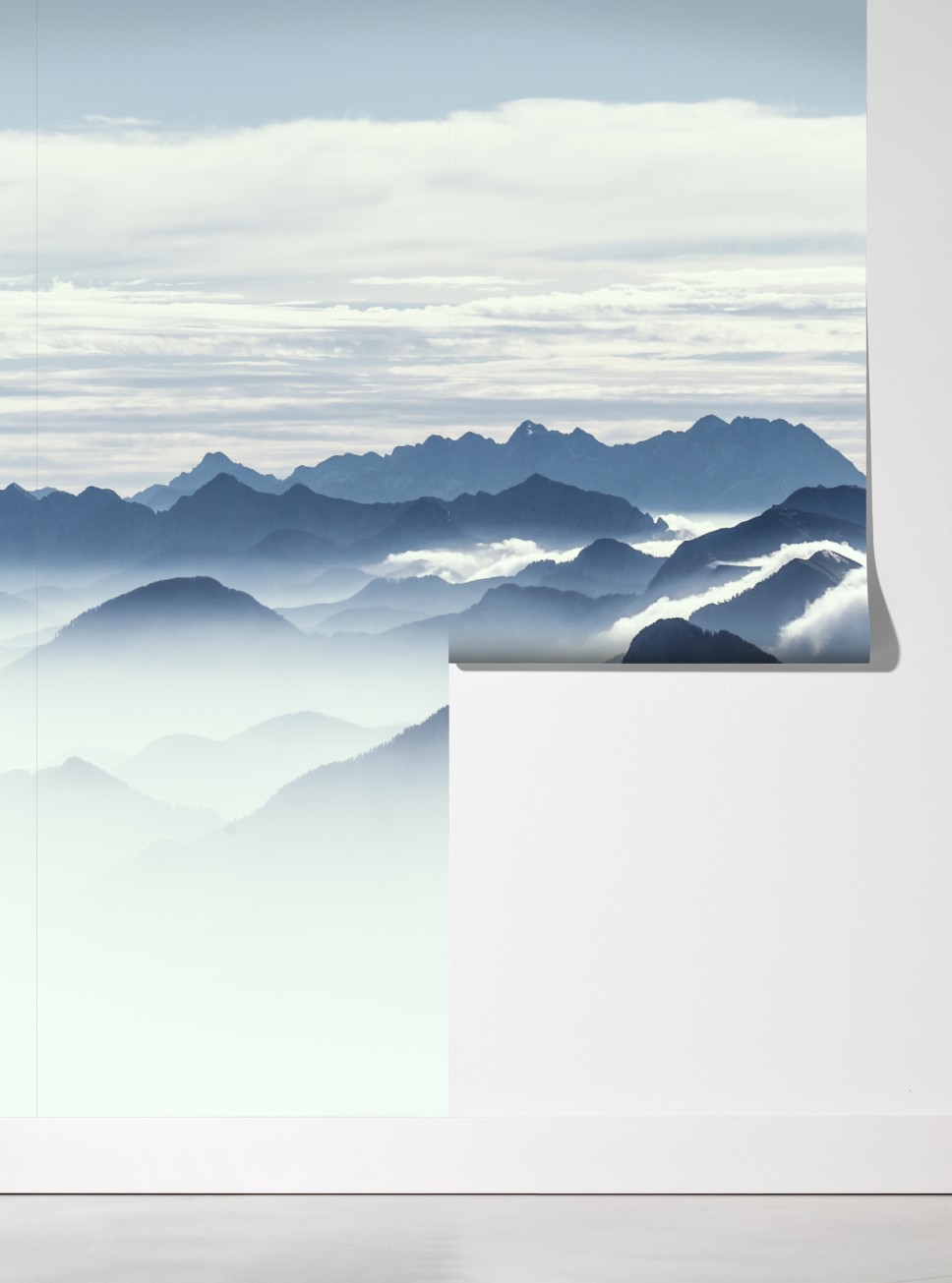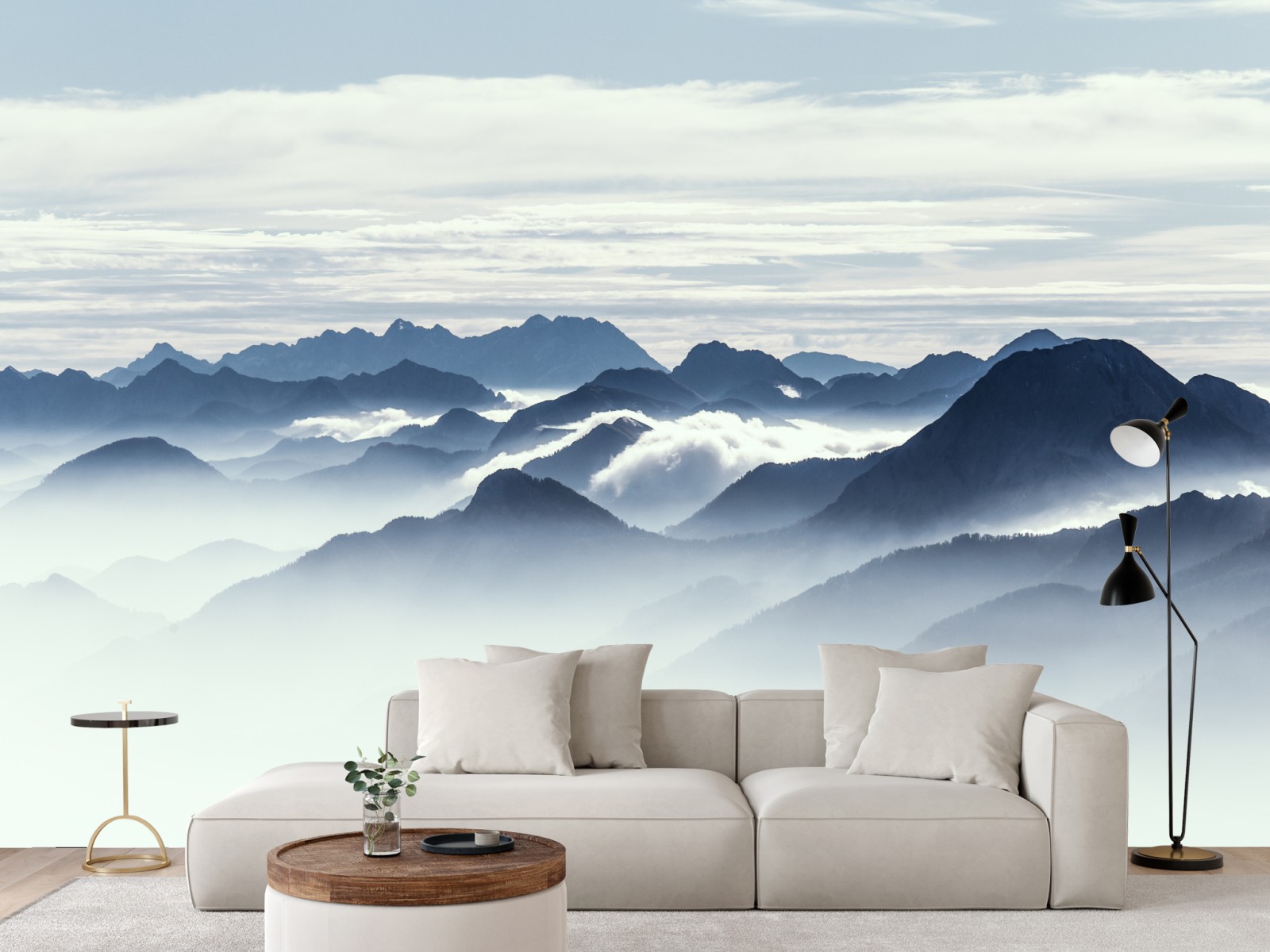 Erleben Sie die beruhigende Schönheit nebliger Bergschichten in kühlen Blautönen, ideal zur Schaffung von Ruhe und Tiefe im Raum.