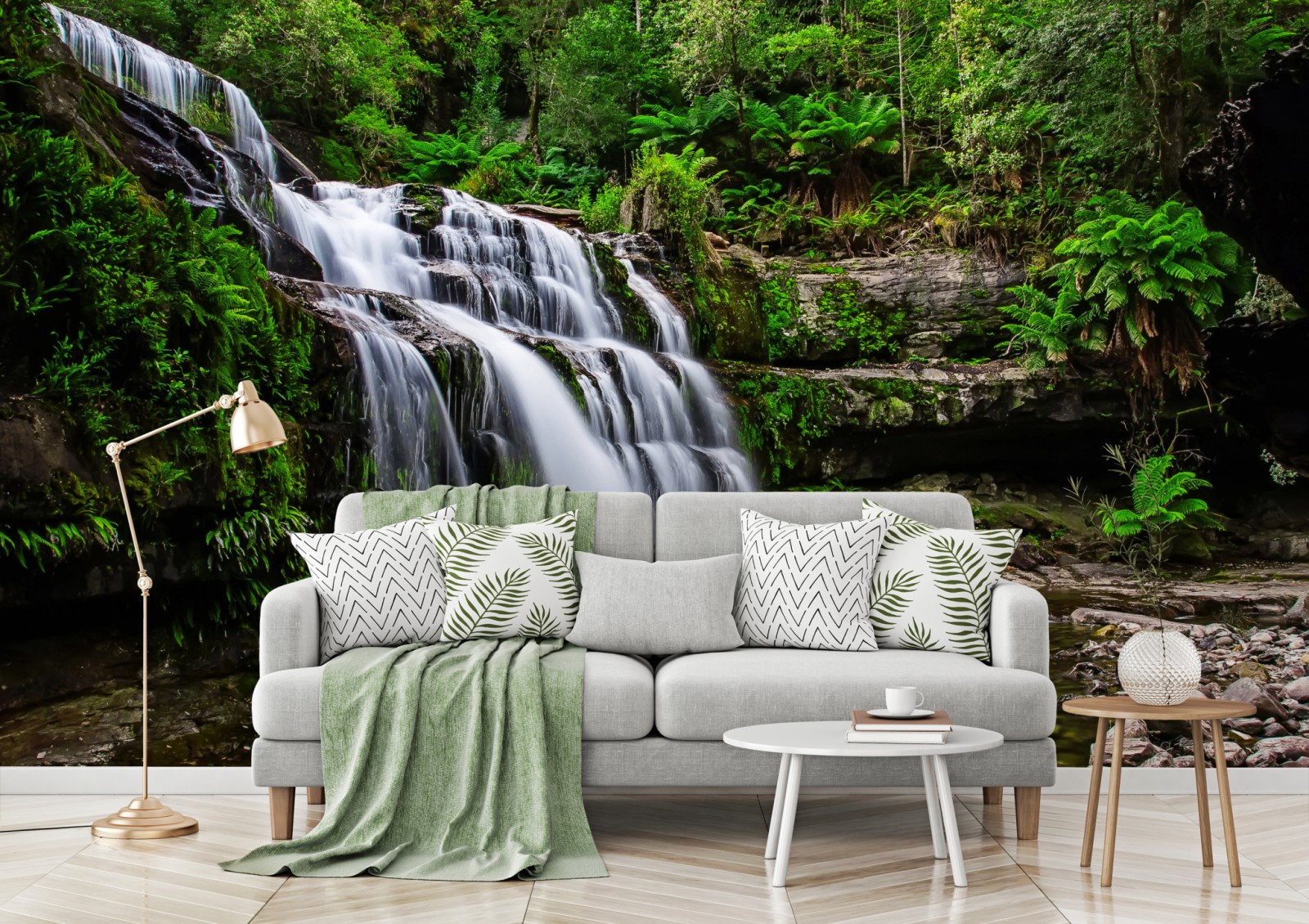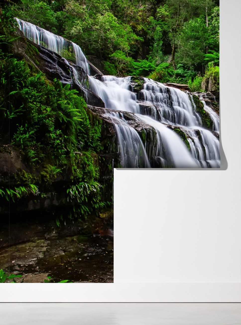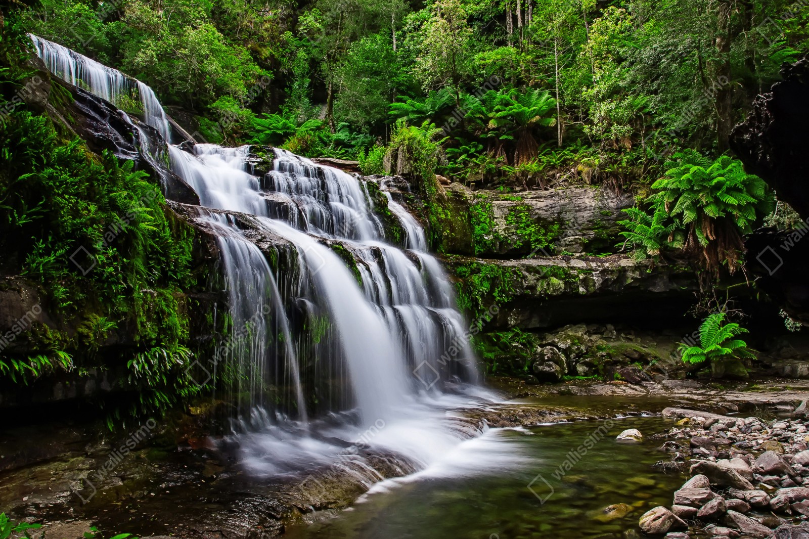 Bringen Sie Ruhe in Ihr Zuhause mit einem stimmungsvollen Foto von Liffey Falls, das durch üppigen Regenwald in Tasmanien fließt.