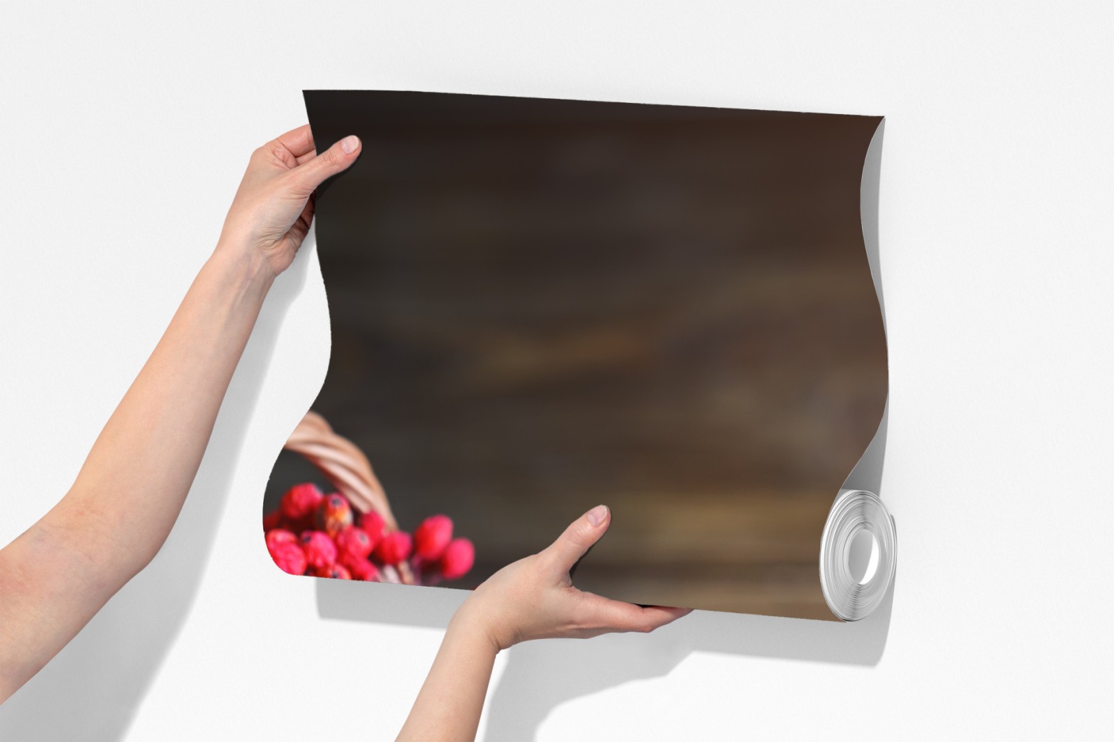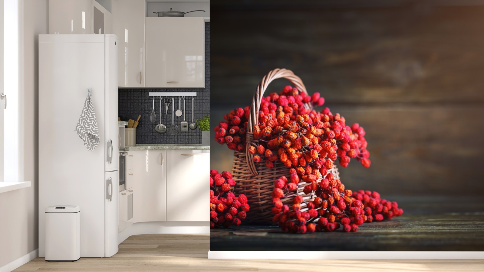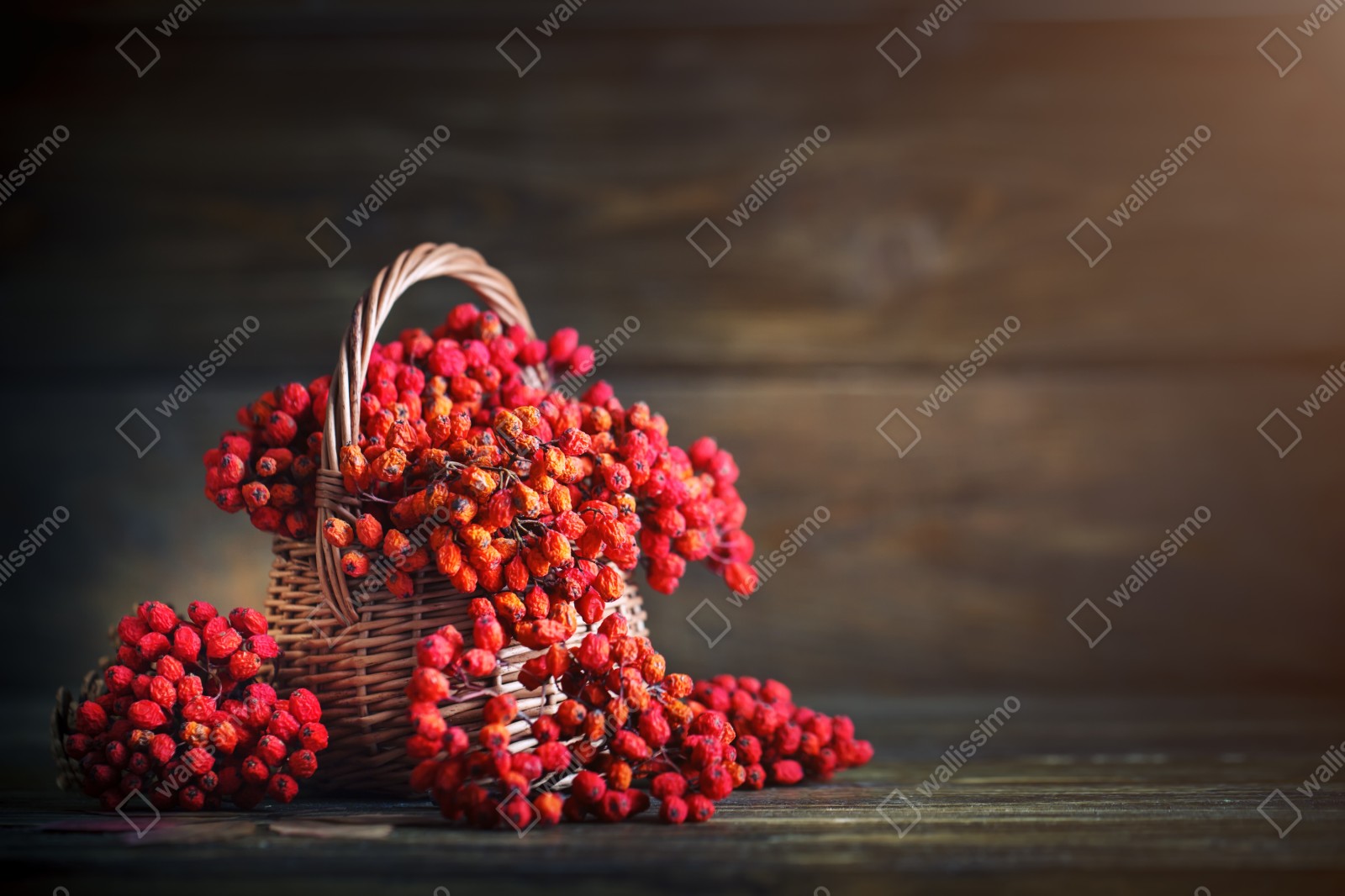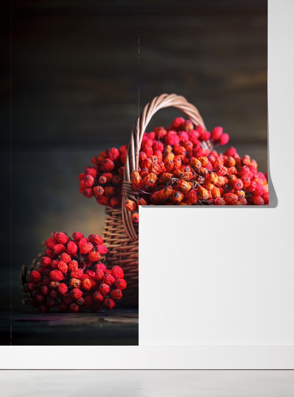 Bringen Sie rustikalen herbstlichen Charme an Ihre Wände mit leuchtend roten Vogelbeeren in einem geflochtenen Korb vor warmem Holz.