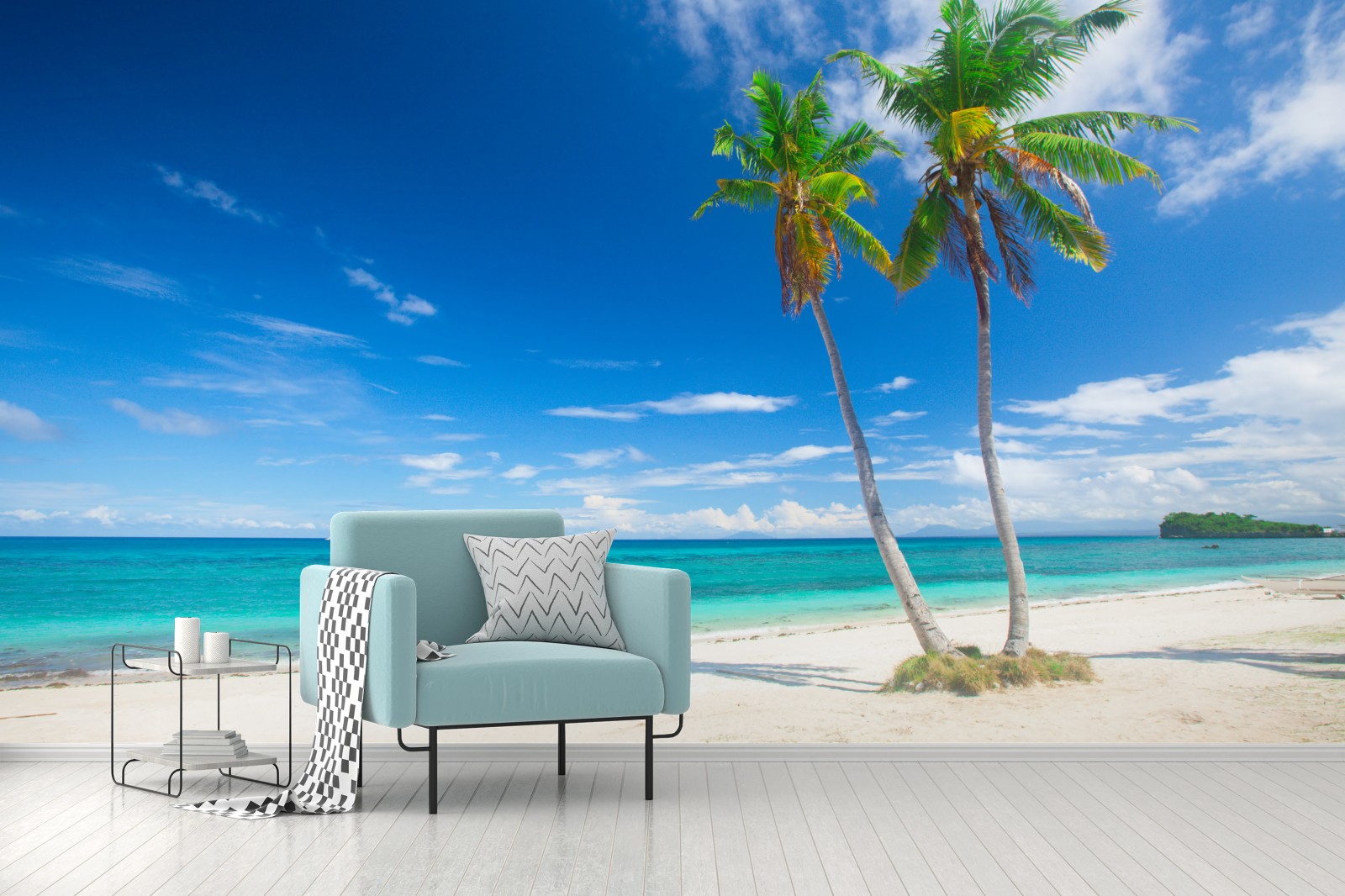 Fototapete Tropische palmen an einem türkisfarbenen strand
