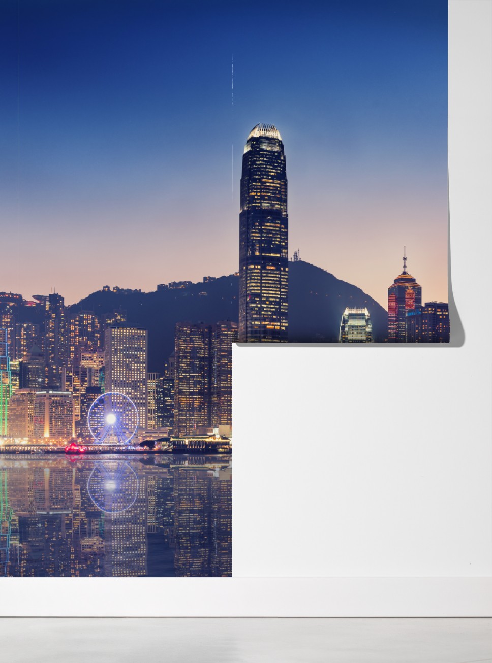 Verwandeln Sie Ihren Raum mit einer atemberaubenden Dämmerungsaufnahme der Hongkong-Skyline und ihren Spiegelungen im Hafen.