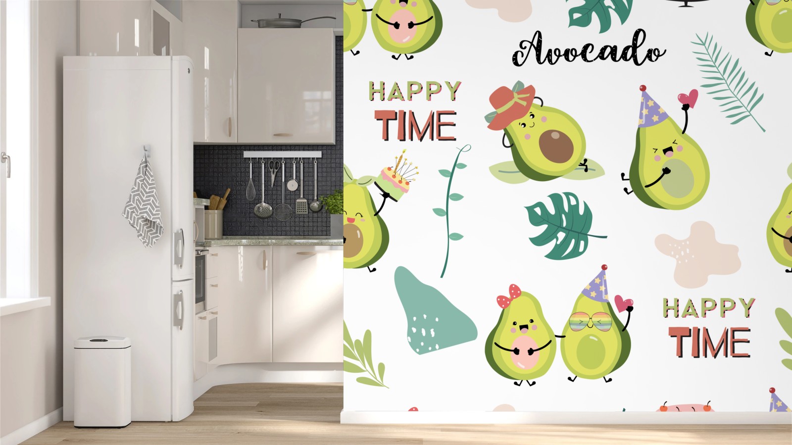 Fröhliches nahtloses Muster mit niedlichen Avocados in pastellfarben, das jeden Raum aufhellt.MehrWeniger