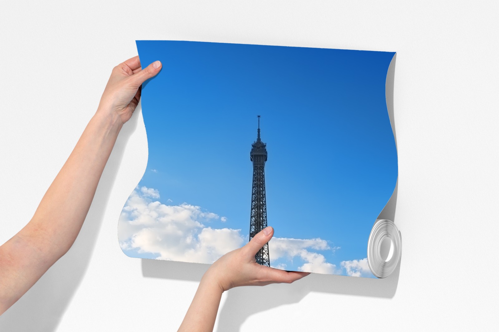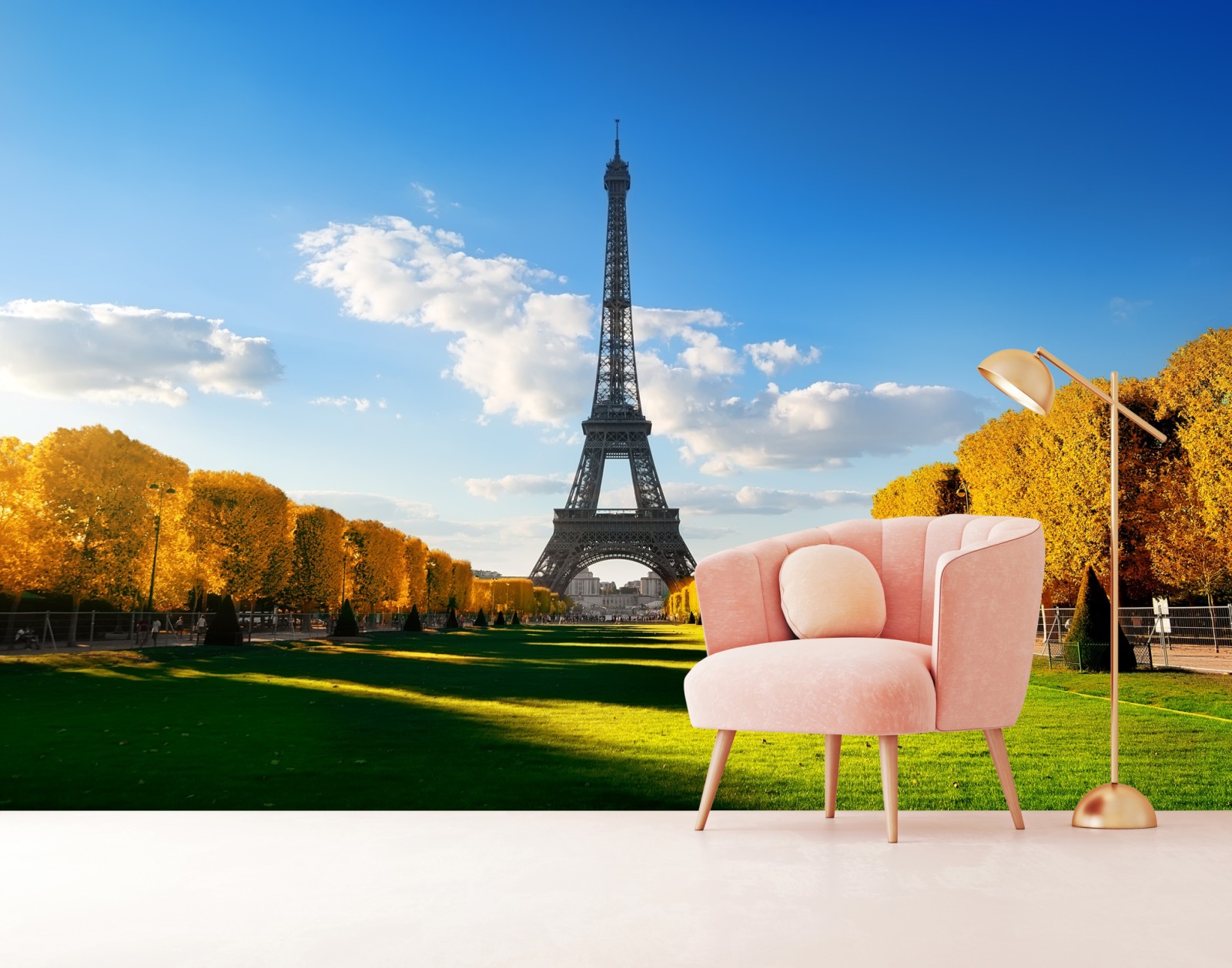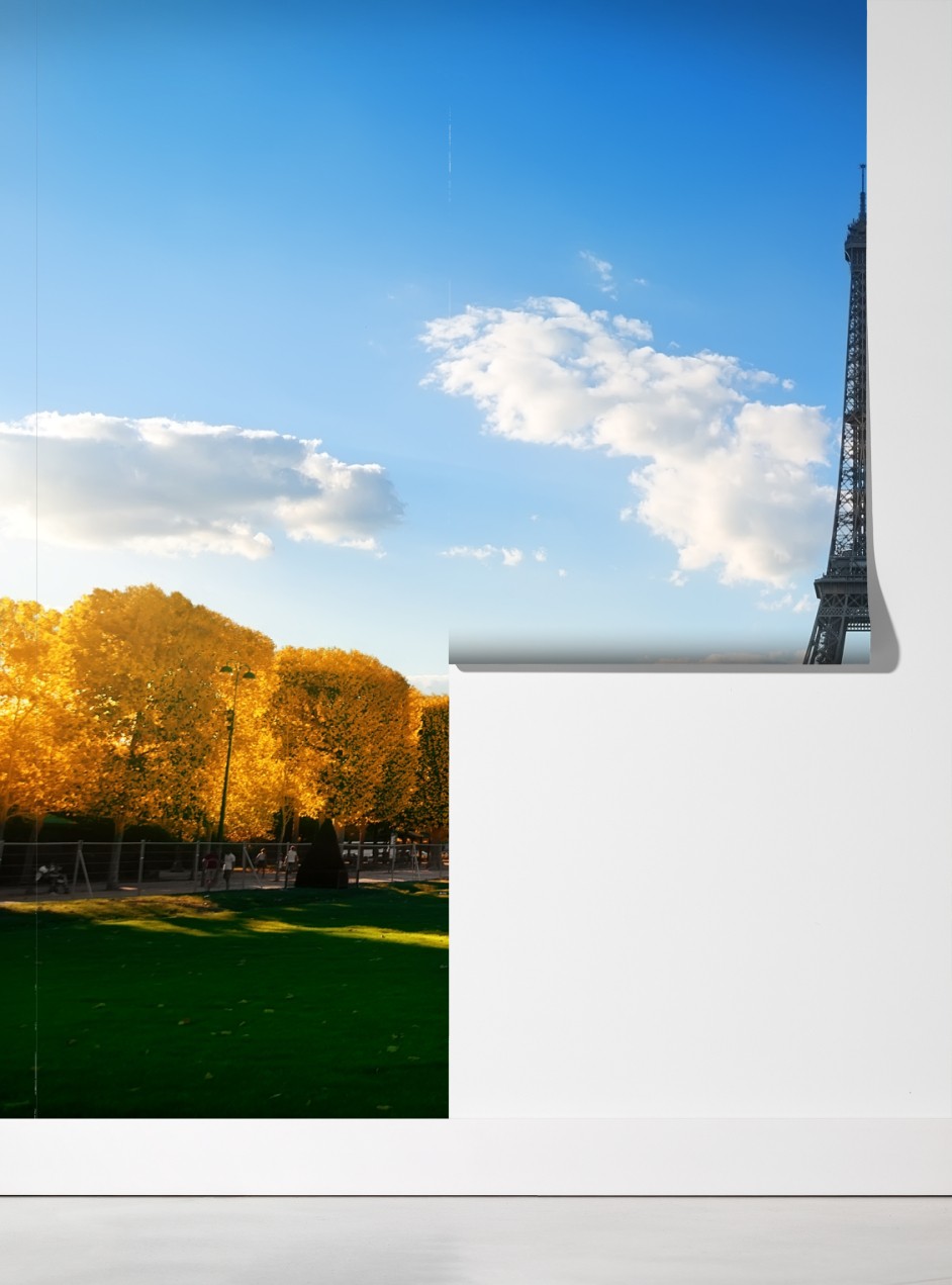 Bringen Sie den romantischen Charme von Paris in Ihr Zuhause mit einem lebendigen Blick auf den Eiffelturm, umgeben von grünen Rasenflächen und blühenden Bäumen.