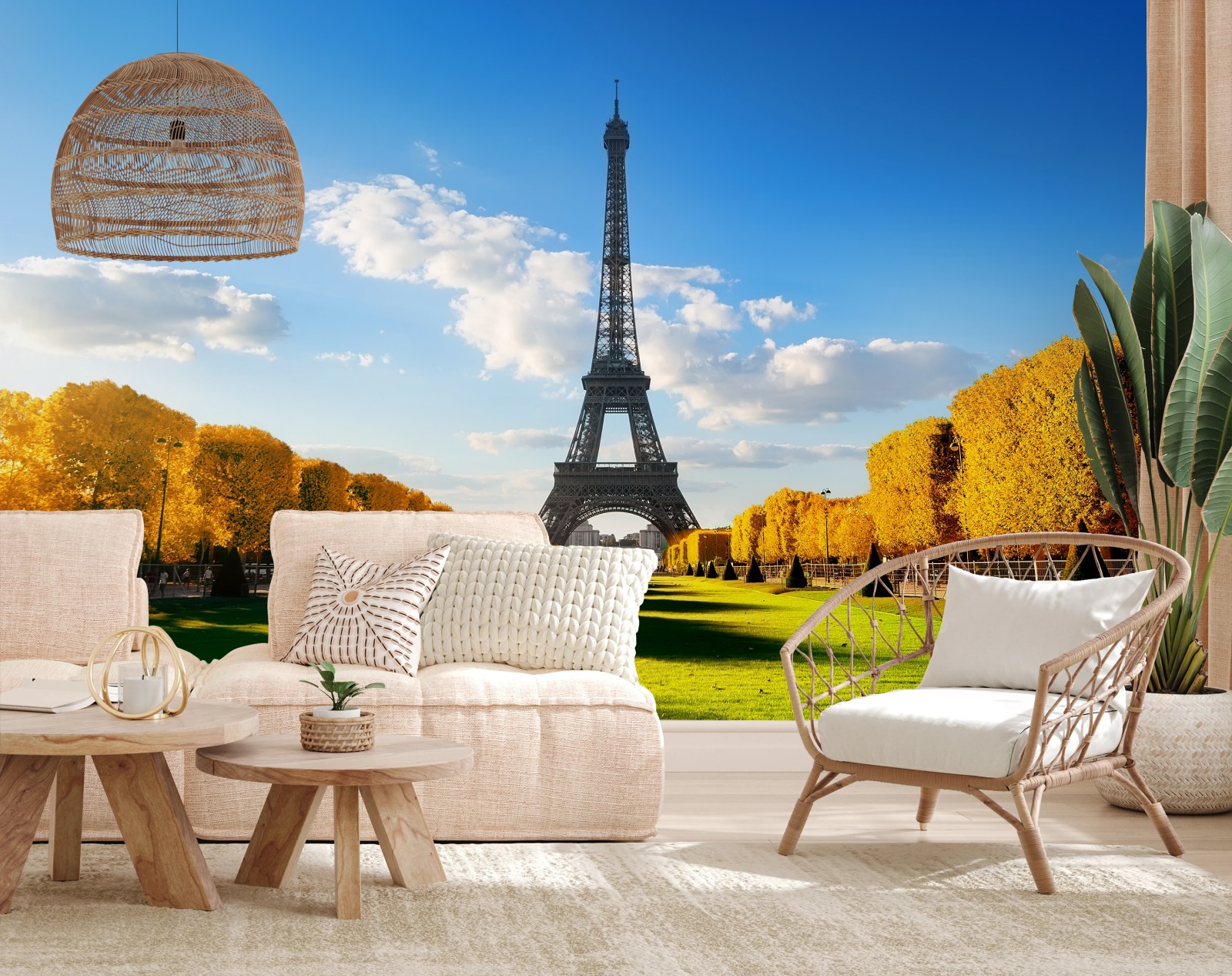 Bringen Sie den romantischen Charme von Paris in Ihr Zuhause mit einem lebendigen Blick auf den Eiffelturm, umgeben von grünen Rasenflächen und blühenden Bäumen.MehrWeniger