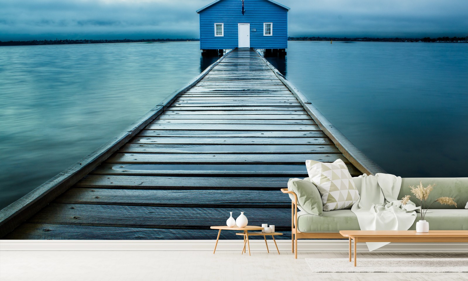 Fototapete Blaues bootshaus am ende des stegs