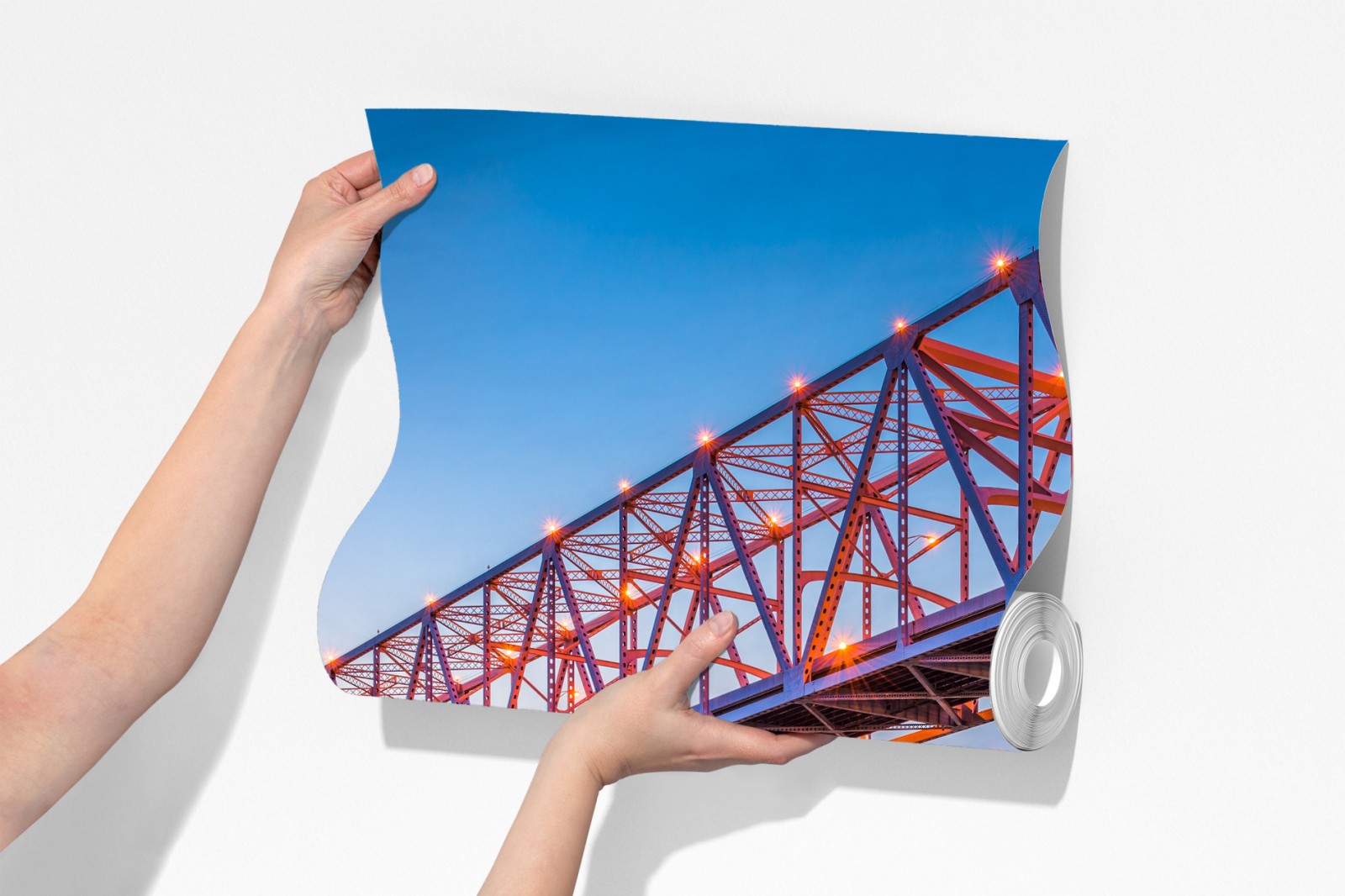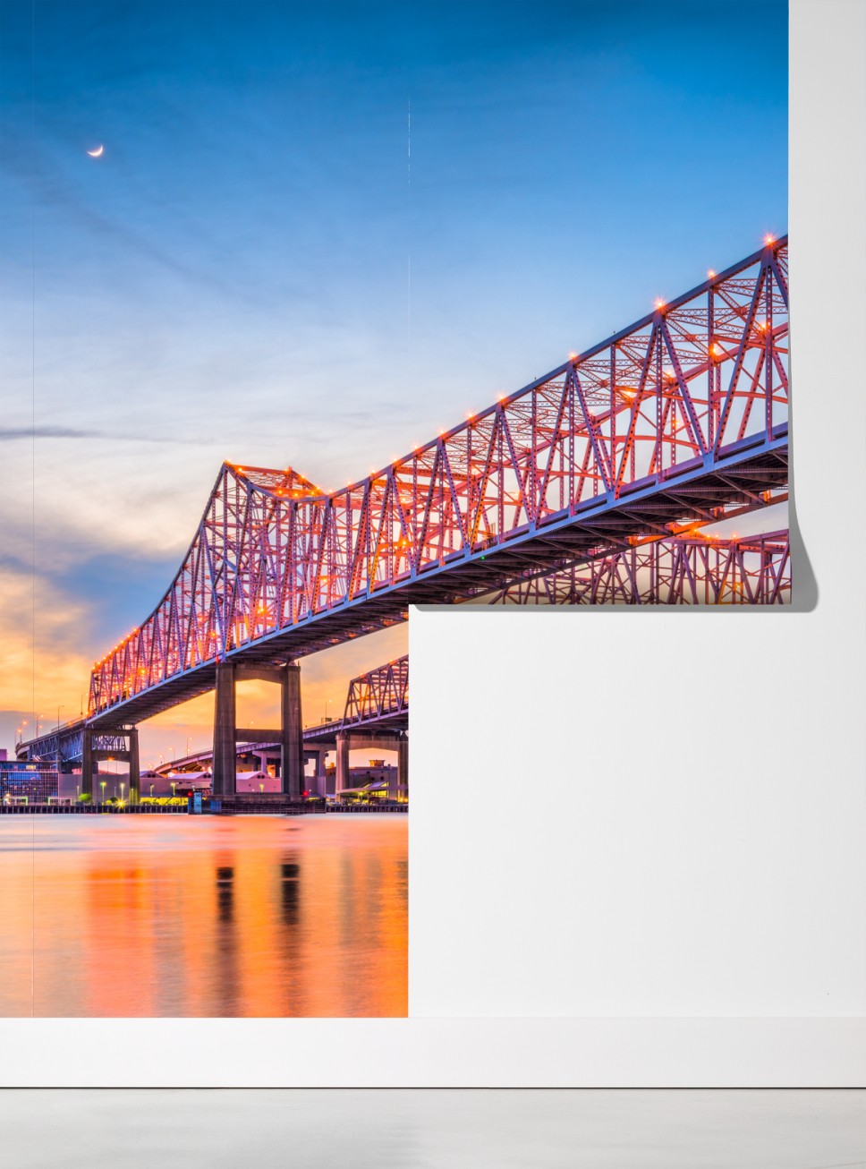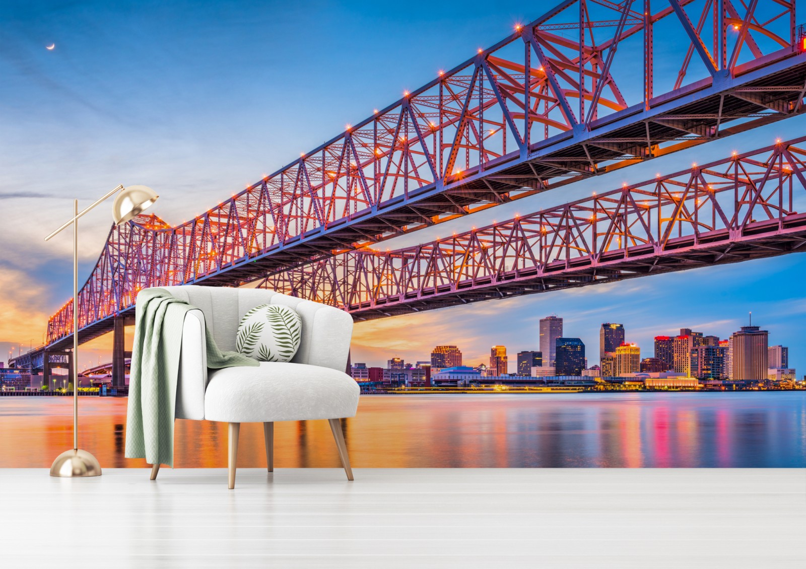 Bringen Sie die lebendige Atmosphäre von New Orleans in Ihr Zuhause mit diesem dramatischen Blick auf Brücke und Skyline bei Sonnenuntergang.