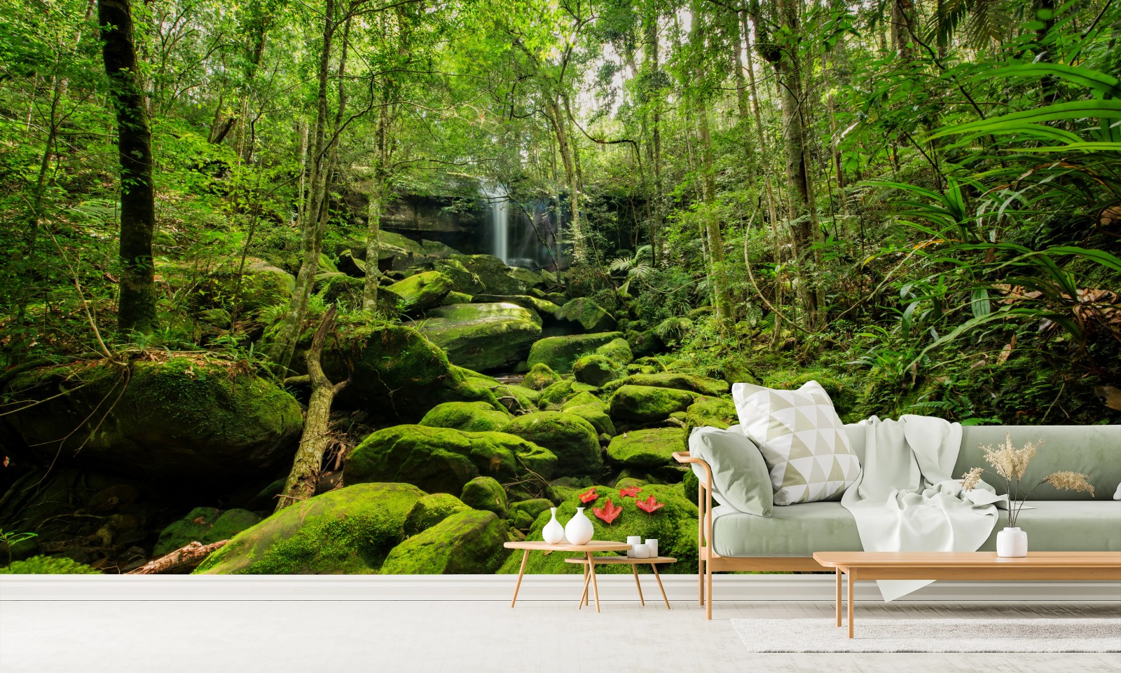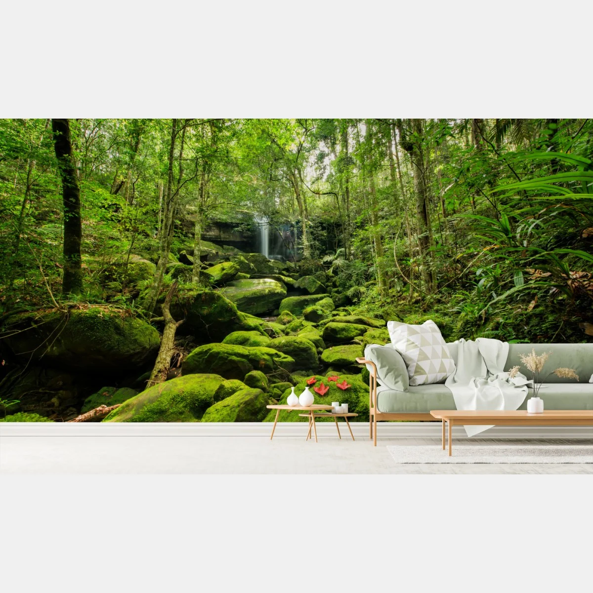 Fototapete Üppiger moosbewachsener wasserfall im tropischen wald