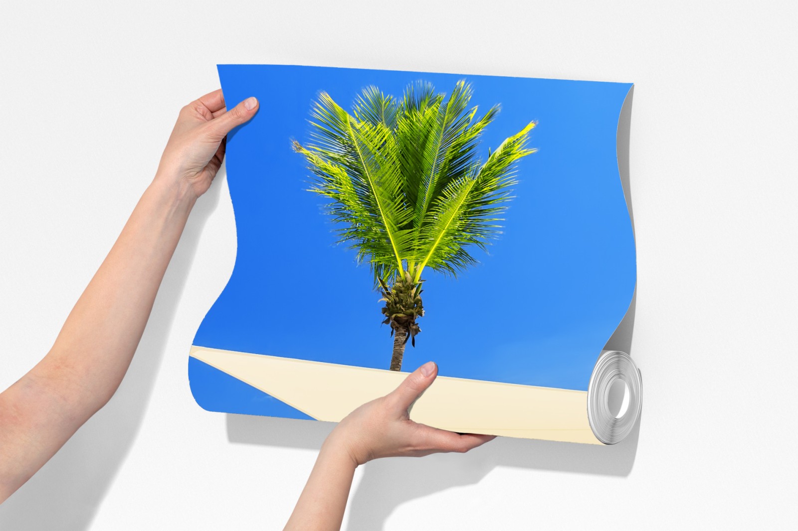 Bringen Sie tropisches Strandflair in Ihr Zuhause mit dieser lebendigen Küstenszene mit Palmen, weißem Sand und türkisfarbenem Meer.