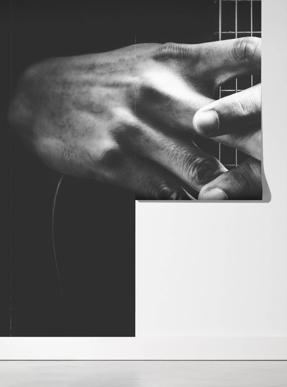 Entdecken Sie eine ausdrucksstarke schwarzweiß-naheinstellung von Händen auf Gitarrensaiten, die jedem Raum einen minimalistischen musikalischen Akzent verleiht.