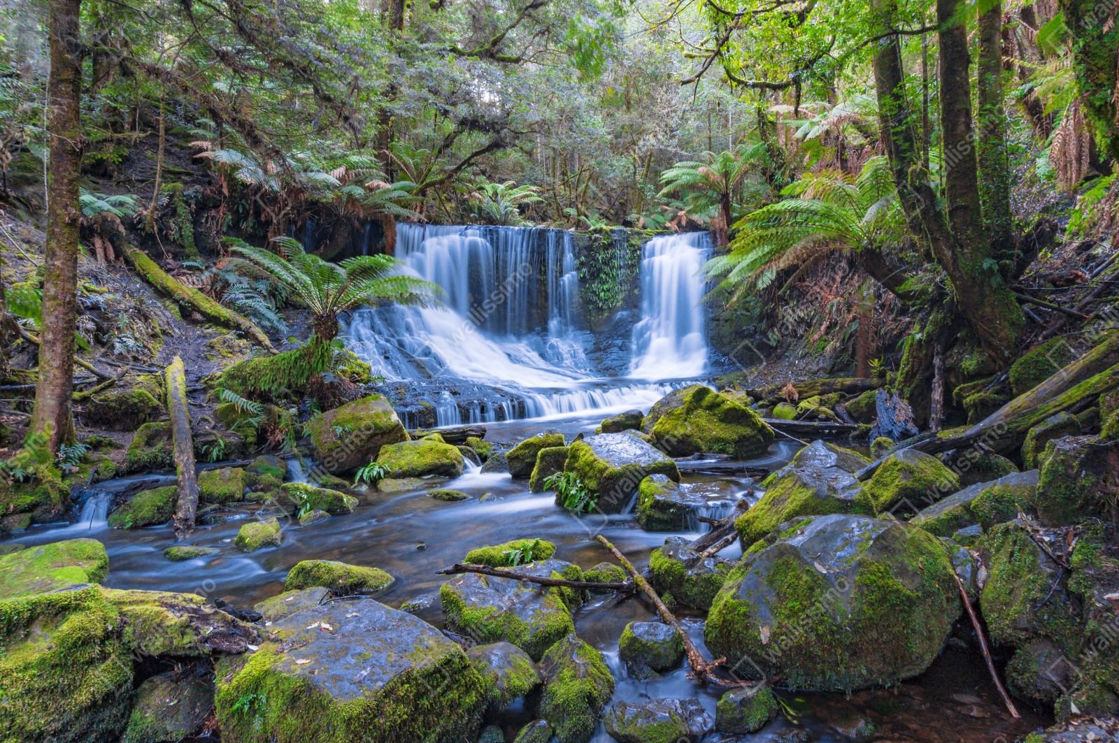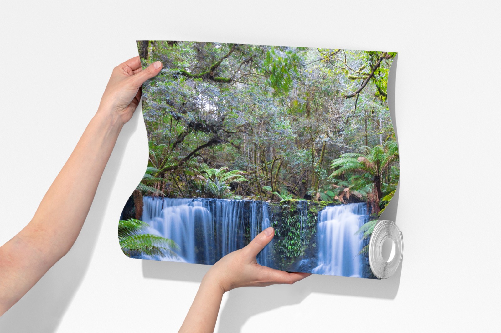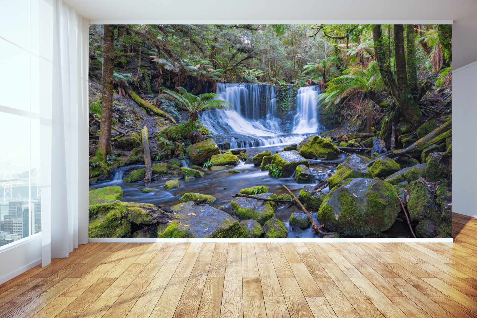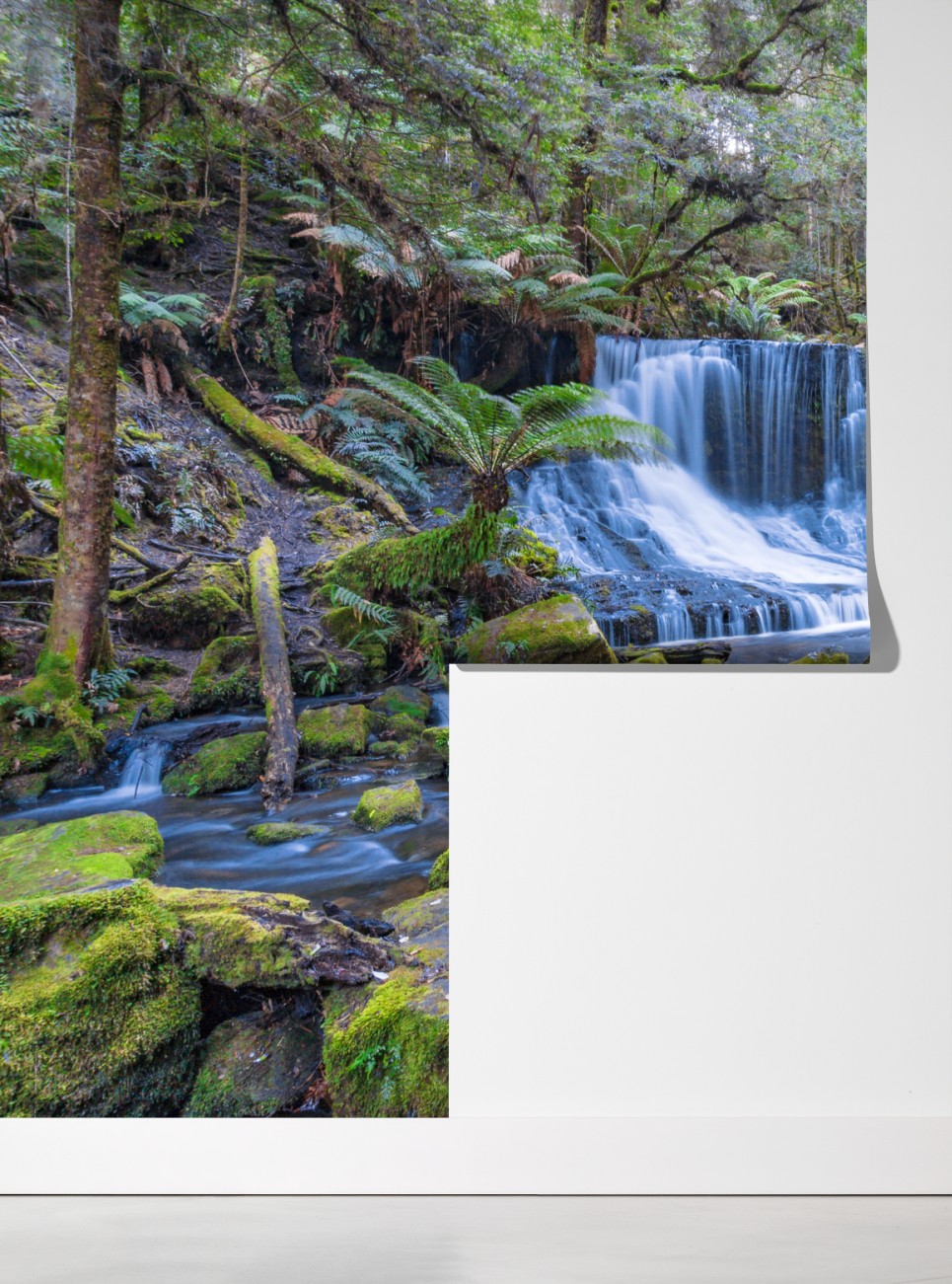Bringen Sie die beruhigende Energie eines moosbedeckten Waldwasserfalls mit diesem lebendigen Naturmotiv in Ihr Zuhause.