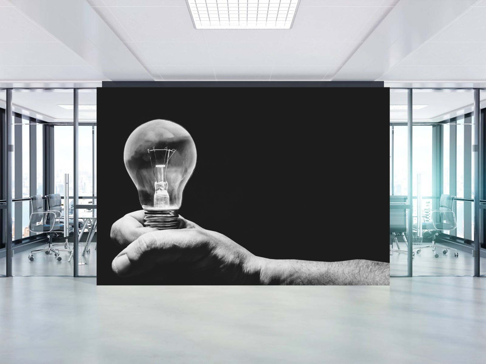 Verleihen Sie Ihrem Raum eine moderne Note mit einem markanten monochromen Foto einer Hand, die eine Glühbirne hält, ideal für minimalistische und zeitgenössische Interieurs.MehrWeniger