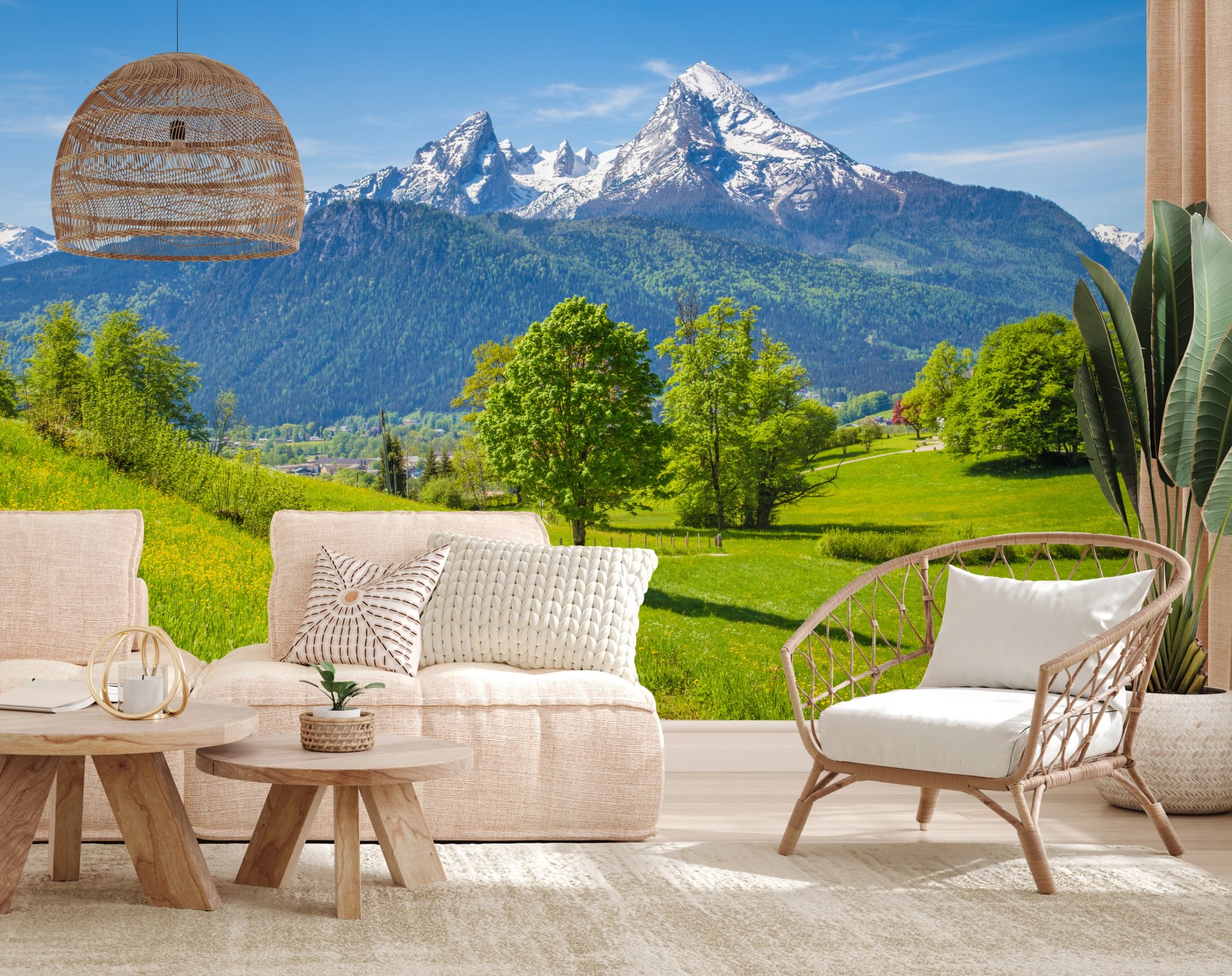 Fototapete Ruhige alpenwiese mit berggipfeln