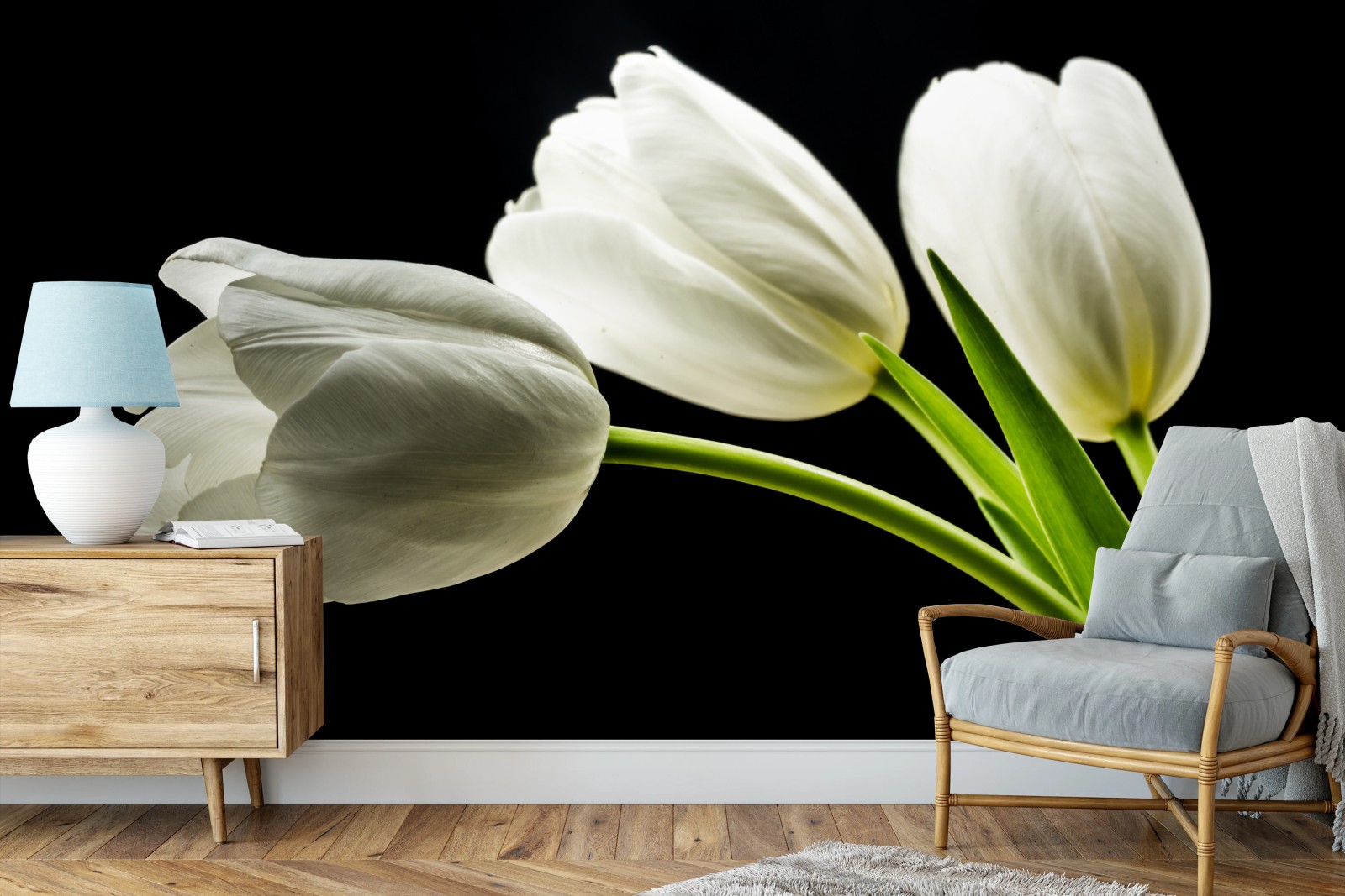 Fototapete Elegante weiße tulpen vor schwarzem hintergrund