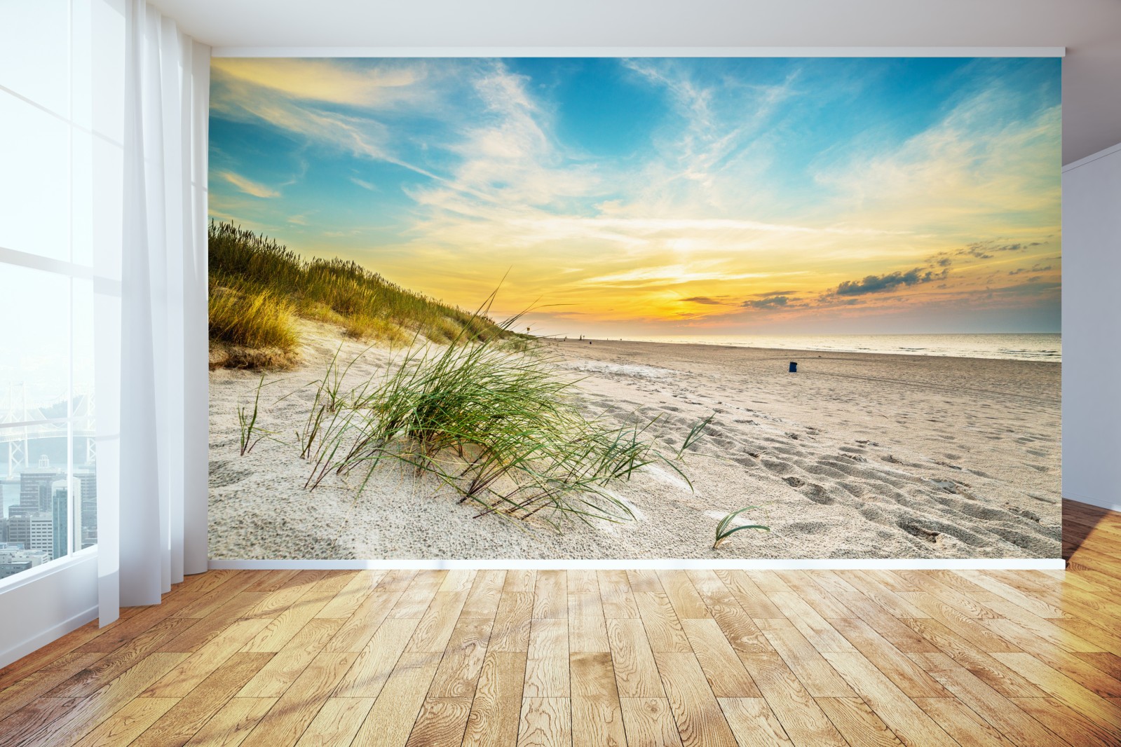 Bringen Sie die beruhigende Stimmung eines Küsten-Sonnenuntergangs in Ihr Zuhause mit diesem lebendigen Meeresbild, das goldenen Sand und ruhiges Meer unter einem pastellfarbenen Himmel zeigt.