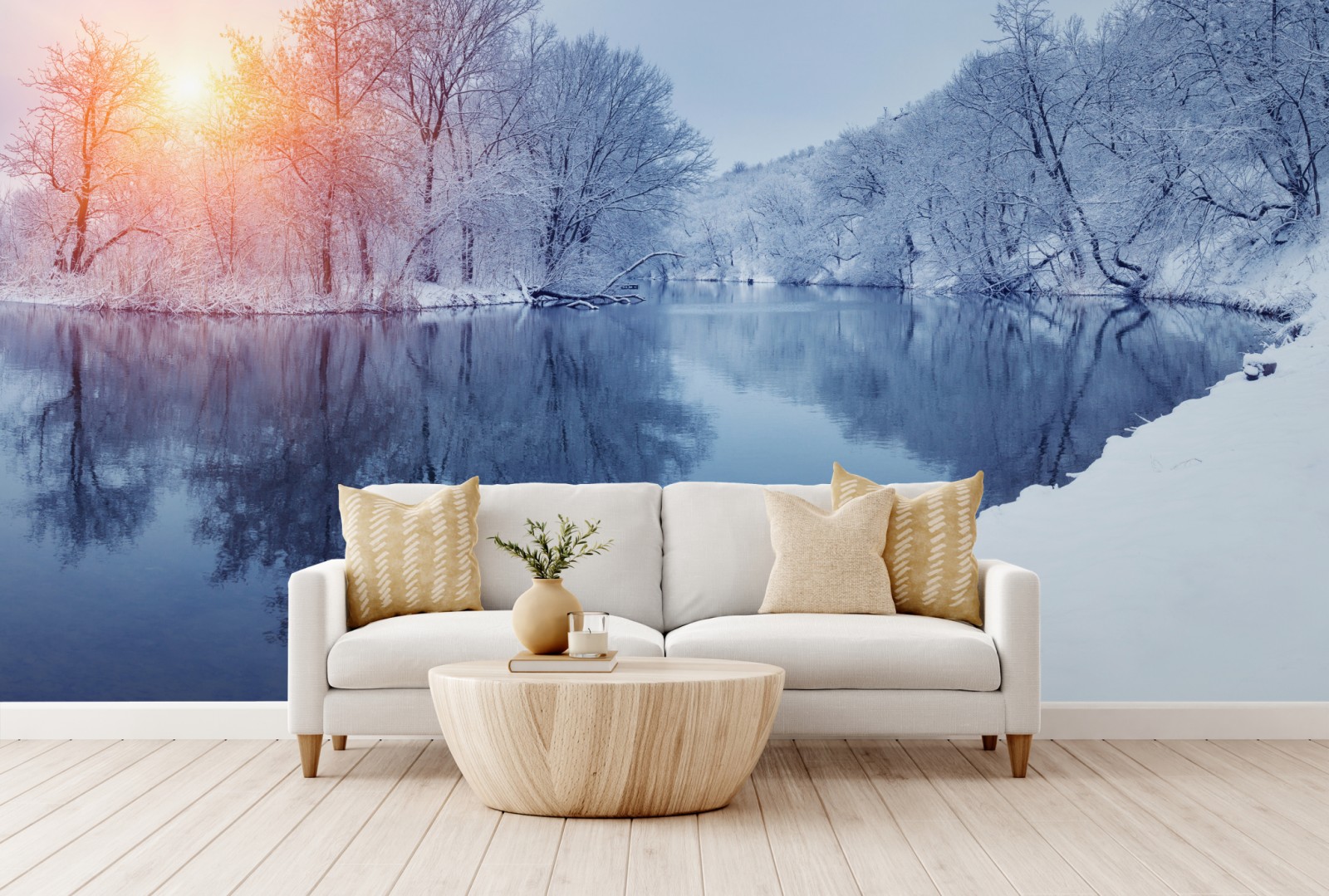 Erleben Sie die ruhige Schönheit eines verschneiten Flussufers im warmen Licht des Sonnenuntergangs, ideal zur Verschönerung Ihres Raums.