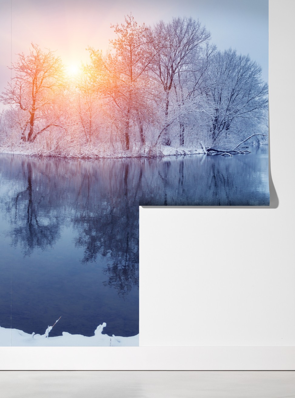 Fototapete winterliche flusslandschaft bei sonnenuntergang