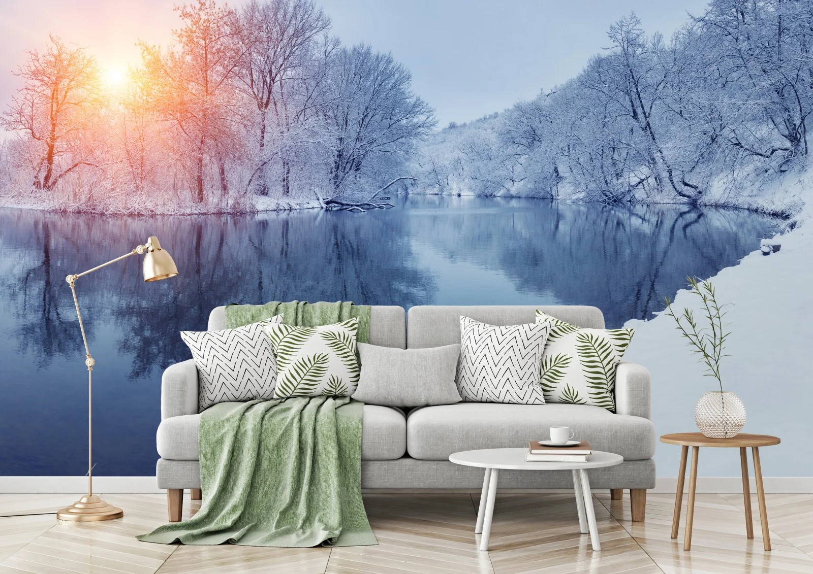 Fototapete Winterliche flusslandschaft bei sonnenuntergang