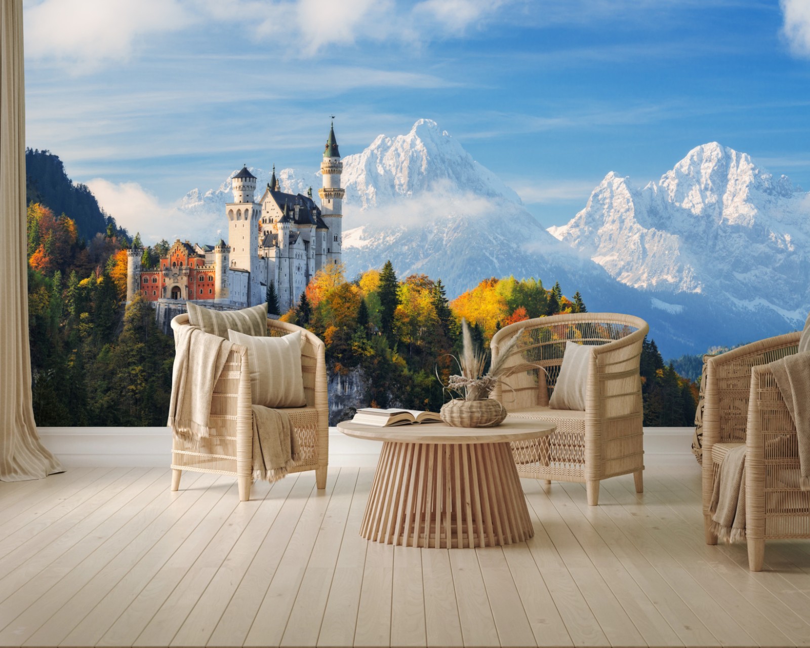 Verleihen Sie Ihren Wänden märchenhaften Charme mit diesem beeindruckenden Blick auf ein Bergschloss, umgeben von herbstlichen Wäldern und schneebedeckten Gipfeln.MehrWeniger