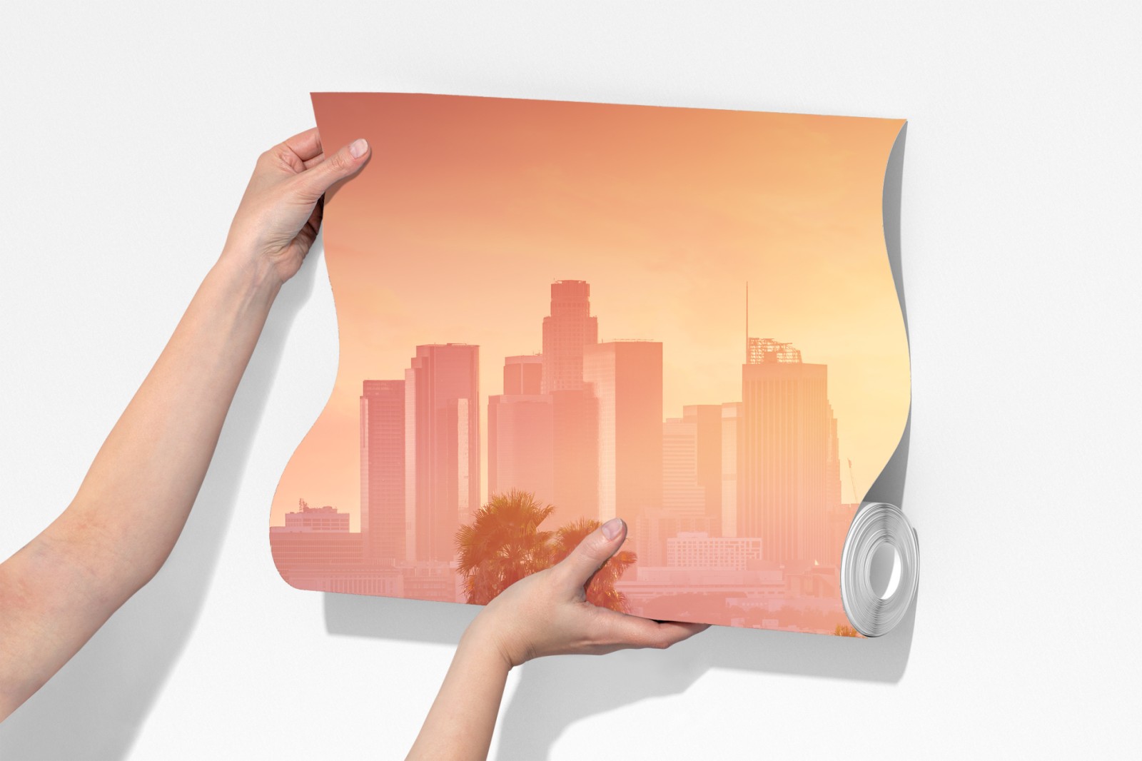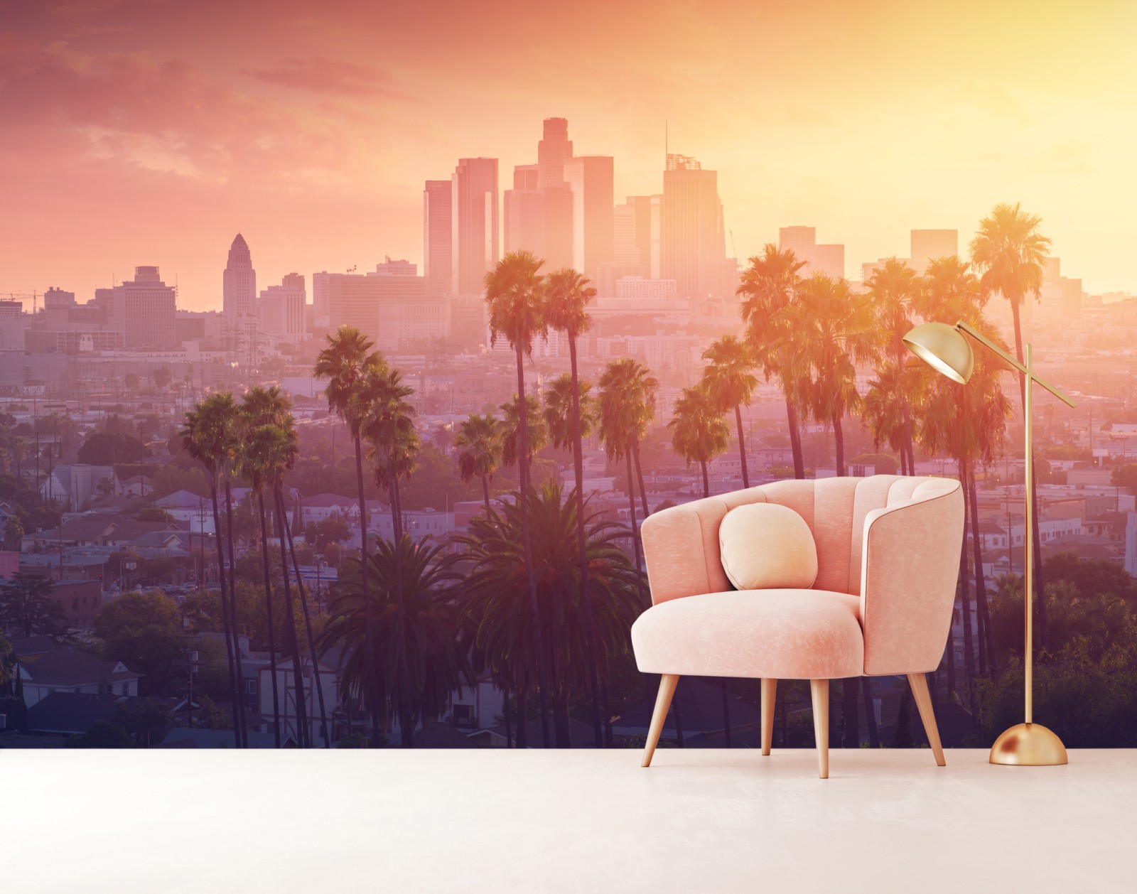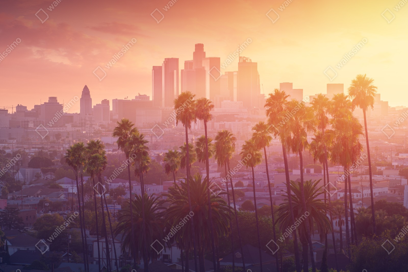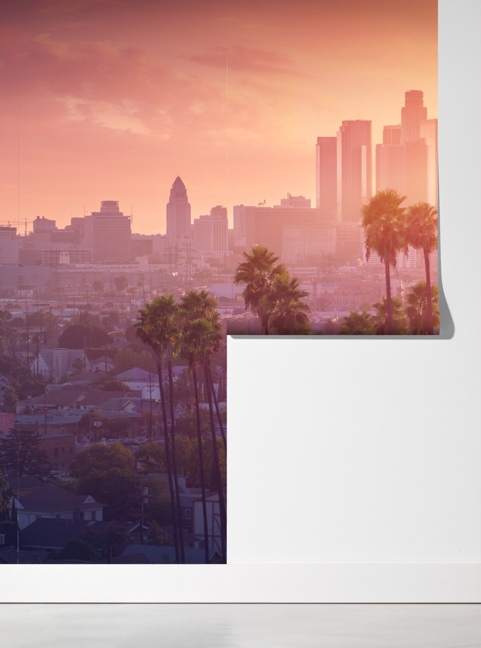 Bringen Sie das warme Leuchten eines Los-Angeles-Sonnenuntergangs in Ihren Raum mit dieser lebendigen Stadtsilhouette und den Palmen im Vordergrund.