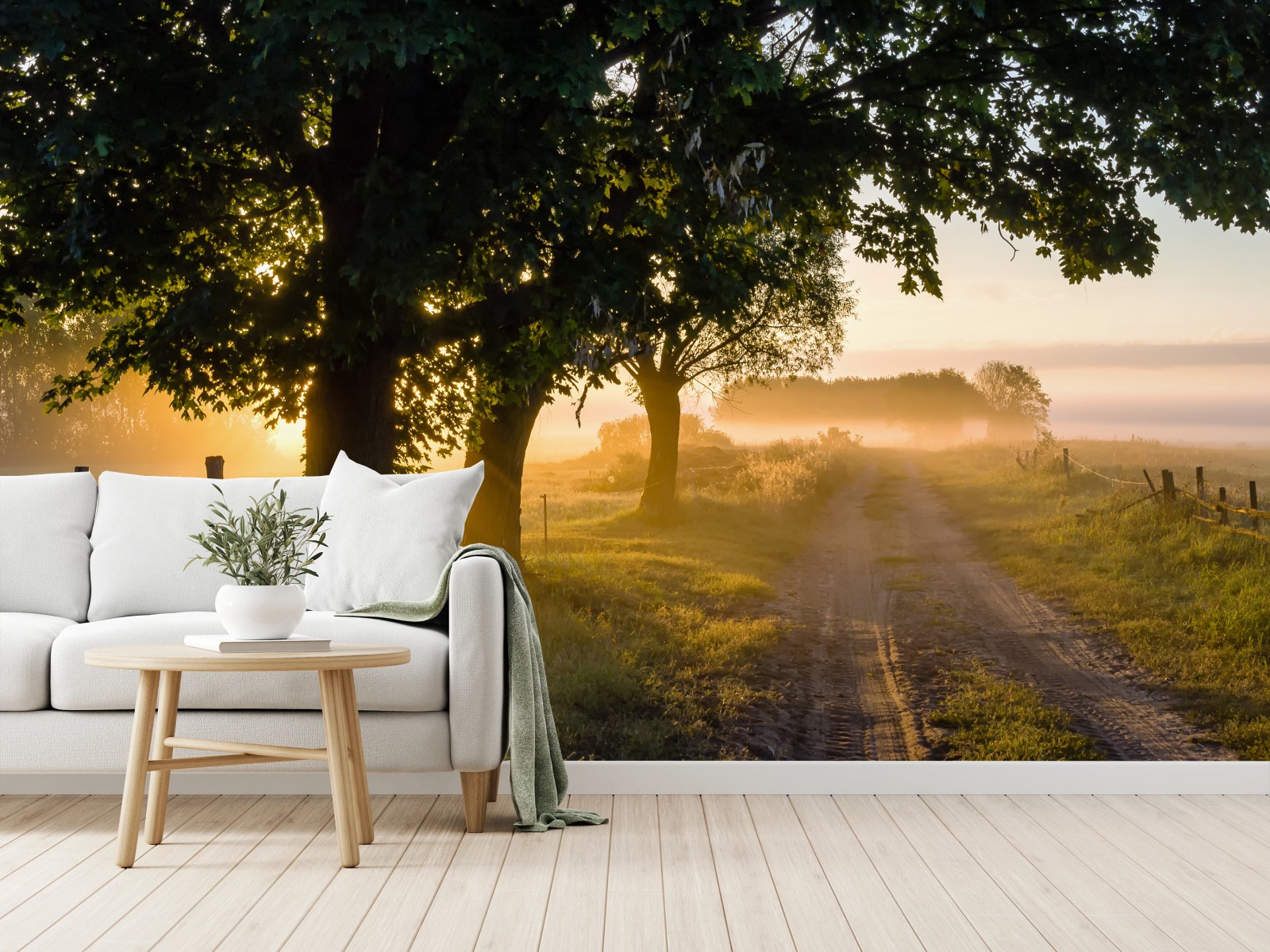 Fototapete Sonnenbeschienener landweg im morgendunst