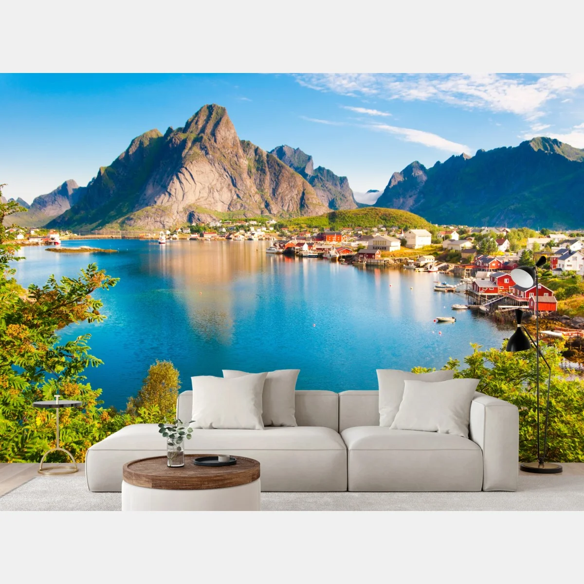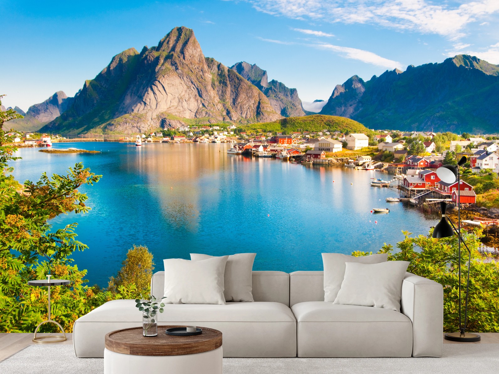 Fototapete Ruhiges fjorddorf mit bergen und spiegelungen