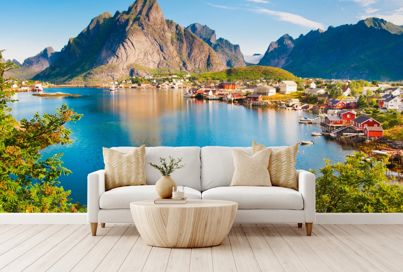 Fototapete Ruhiges fjorddorf mit bergen und spiegelungen