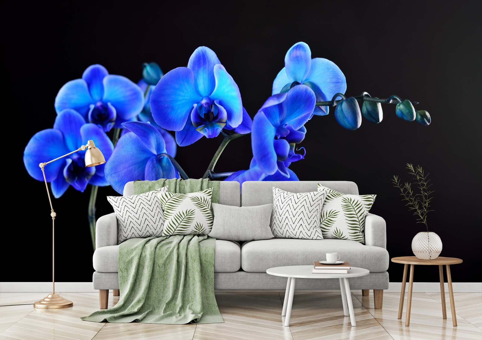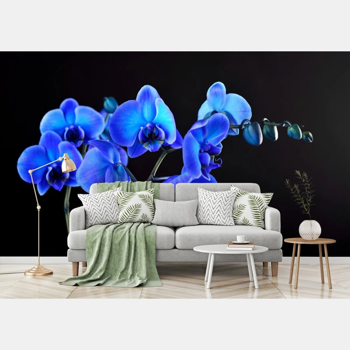 Fototapete Leuchtende blaue orchidee vor schwarzem hintergrund