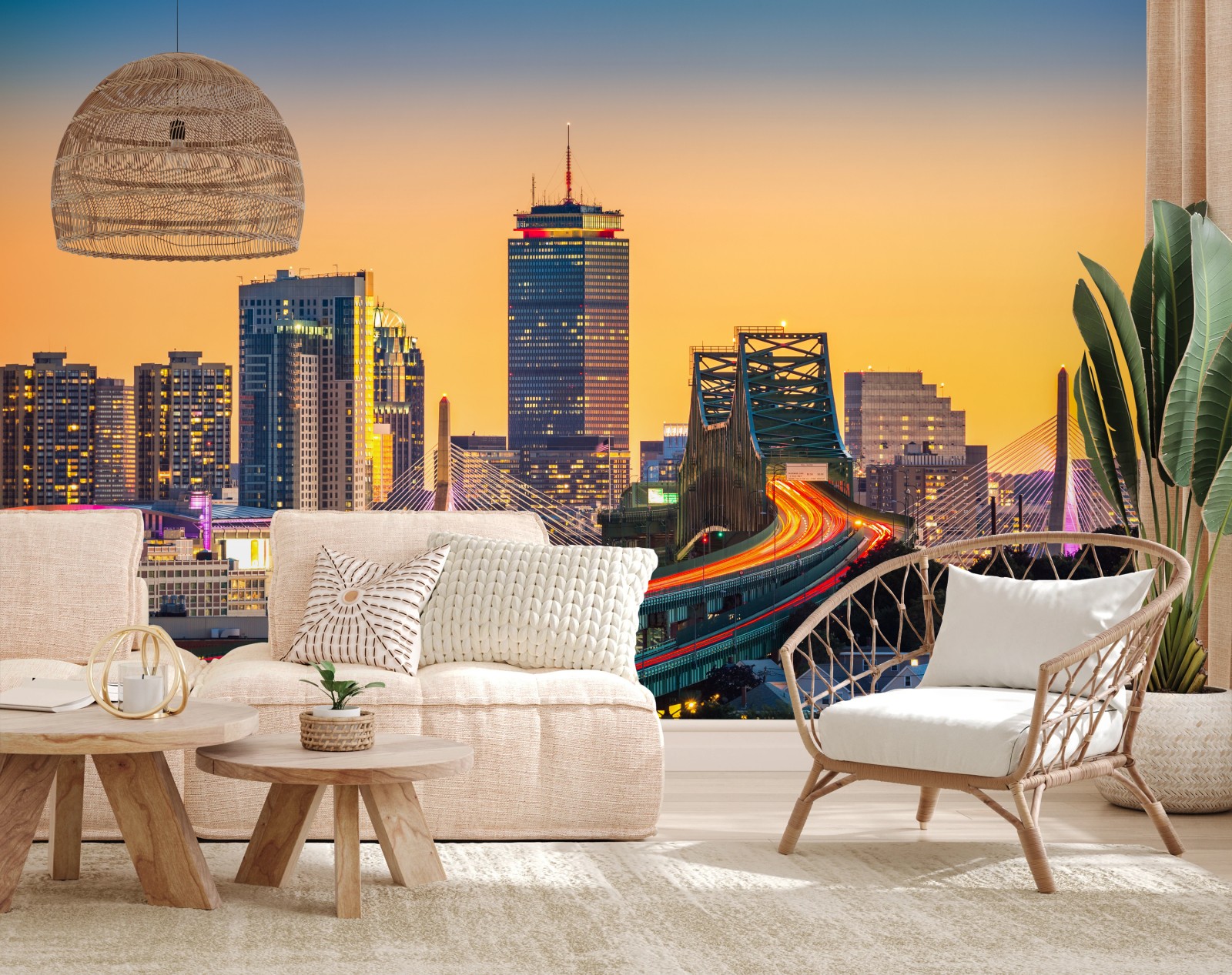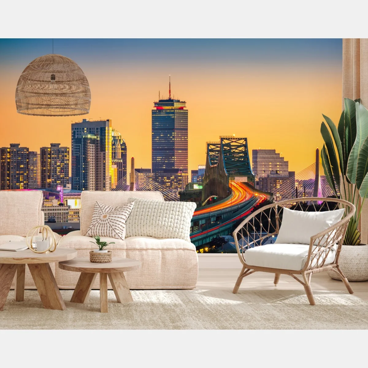 Fototapete Panorama von Boston bei sonnenuntergang mit Zakim und Tobin brücken