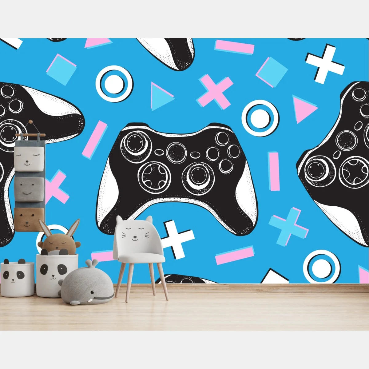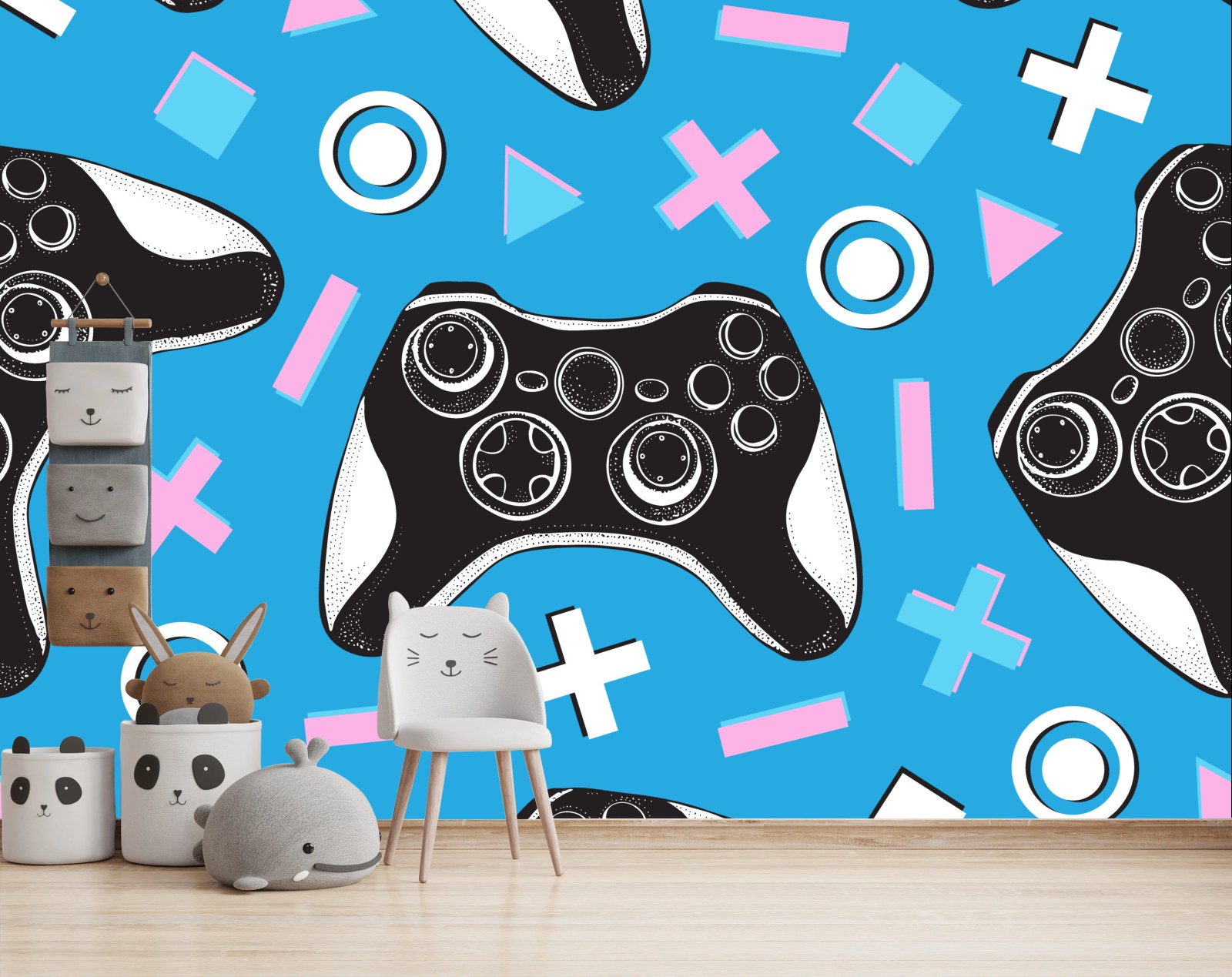 Kräftiges, verspieltes Muster mit Controllern und geometrischen Formen in lebhaftem Blau, ideal für Kinderzimmer oder Gaming-Ecken.MehrWeniger