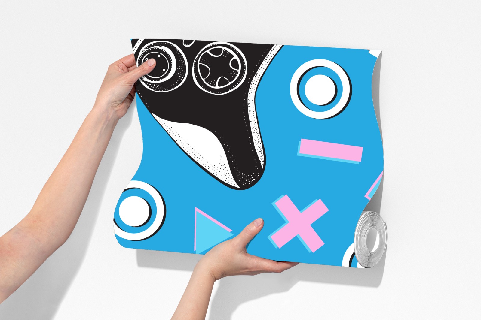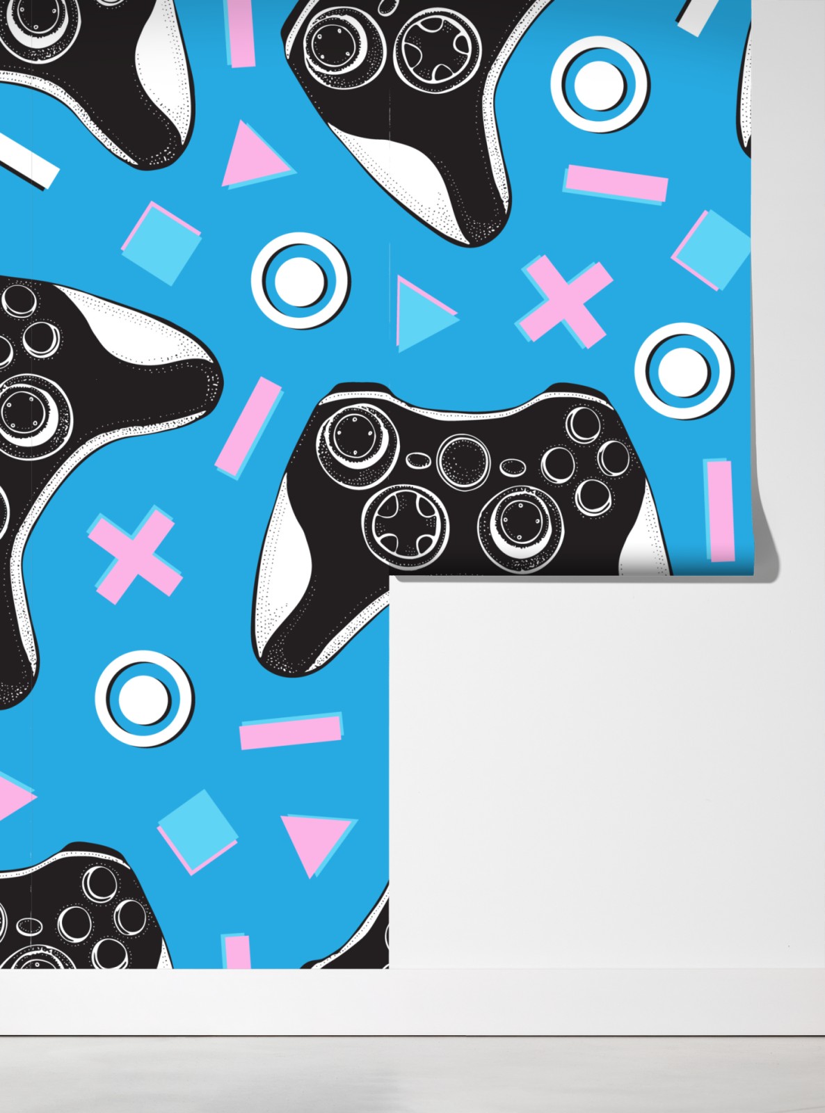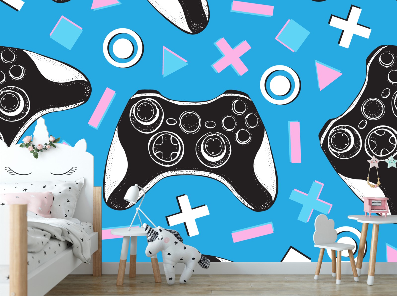 Kräftiges, verspieltes Muster mit Controllern und geometrischen Formen in lebhaftem Blau, ideal für Kinderzimmer oder Gaming-Ecken.