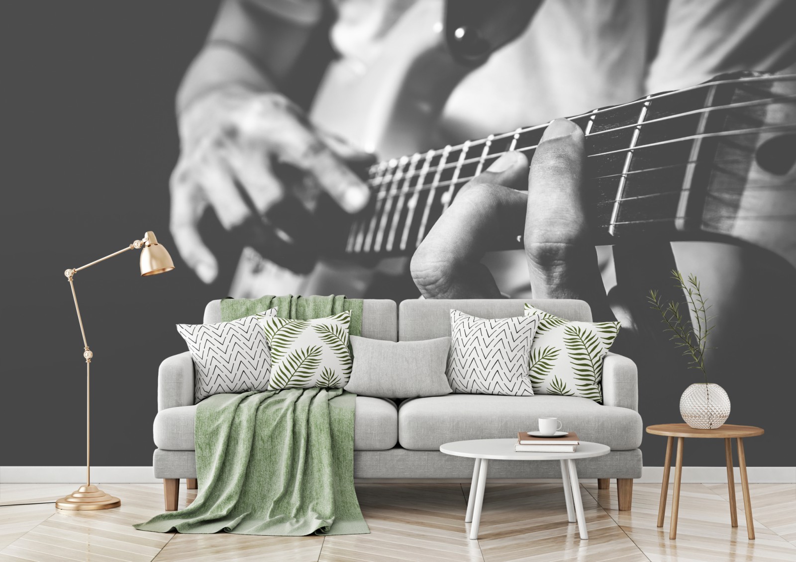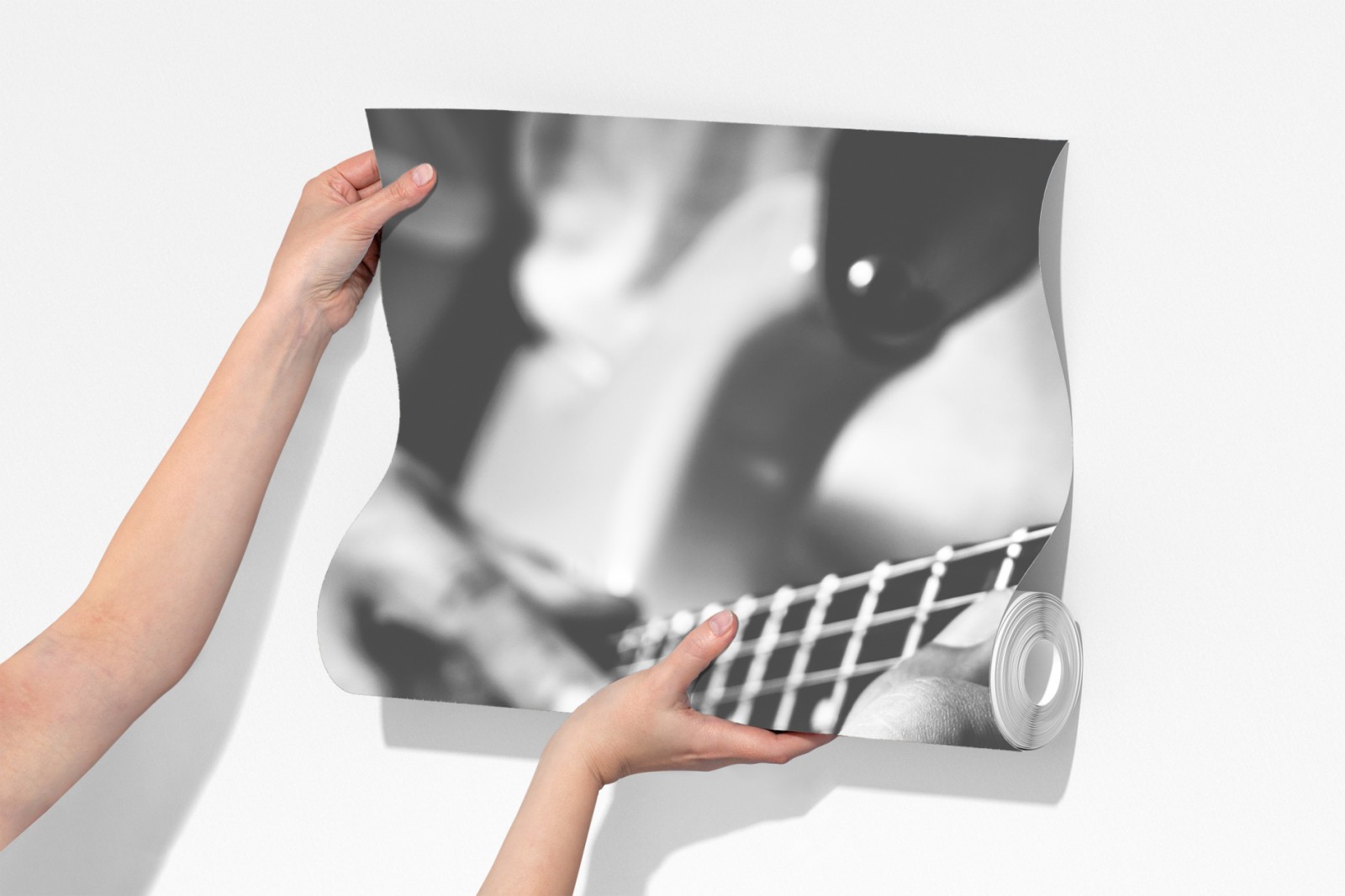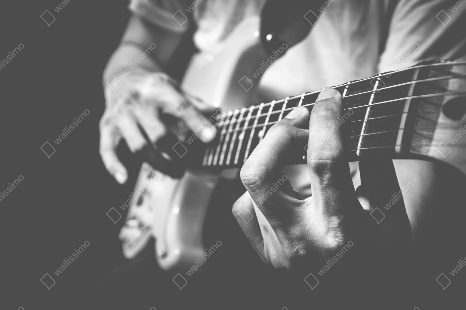 Erleben Sie die Leidenschaft der Musik mit dieser eindrucksvollen monochromen Nahaufnahme einer E-Gitarre, ideal für Musikliebhaber und moderne Wohnräume.