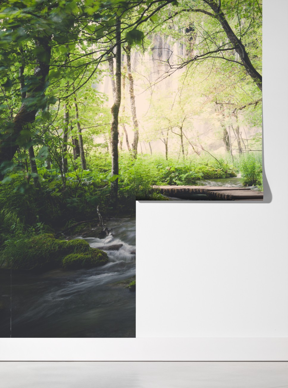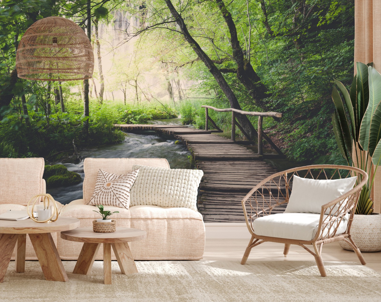 Bringen Sie die beruhigende Atmosphäre eines Flussufers mit dieser Szene eines hölzernen Stegs im grünen Wald in Ihren Raum.