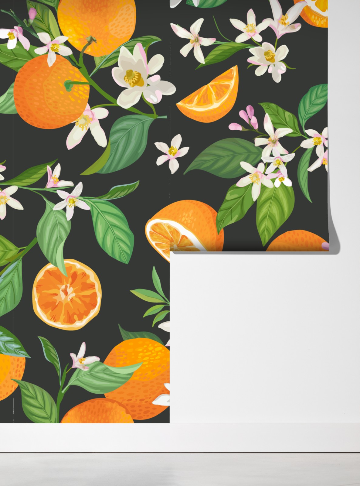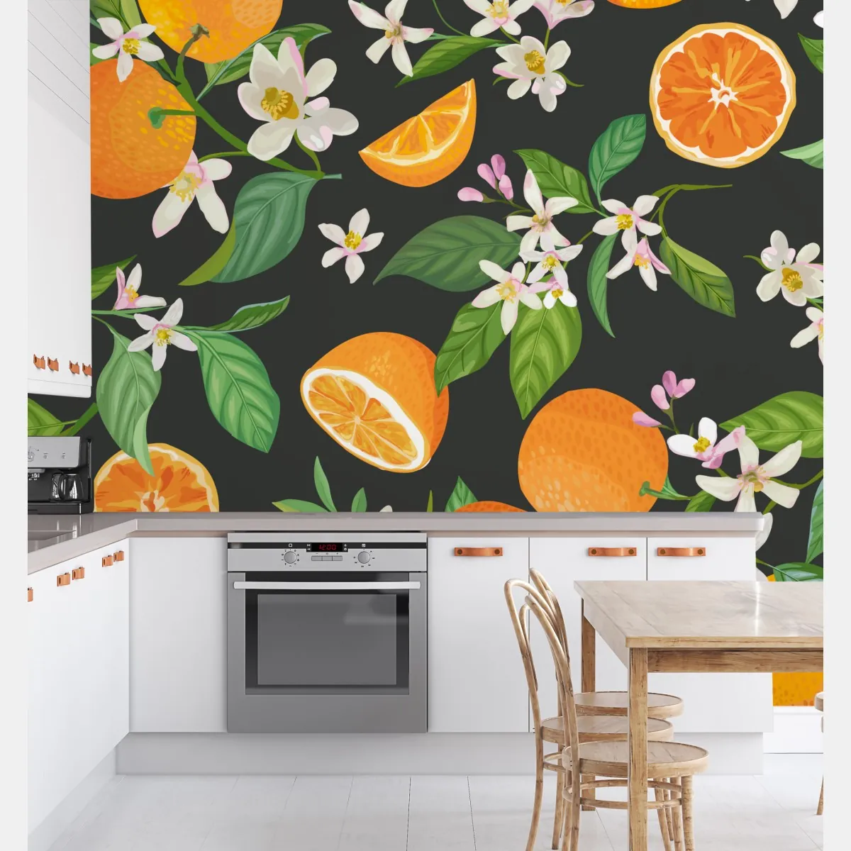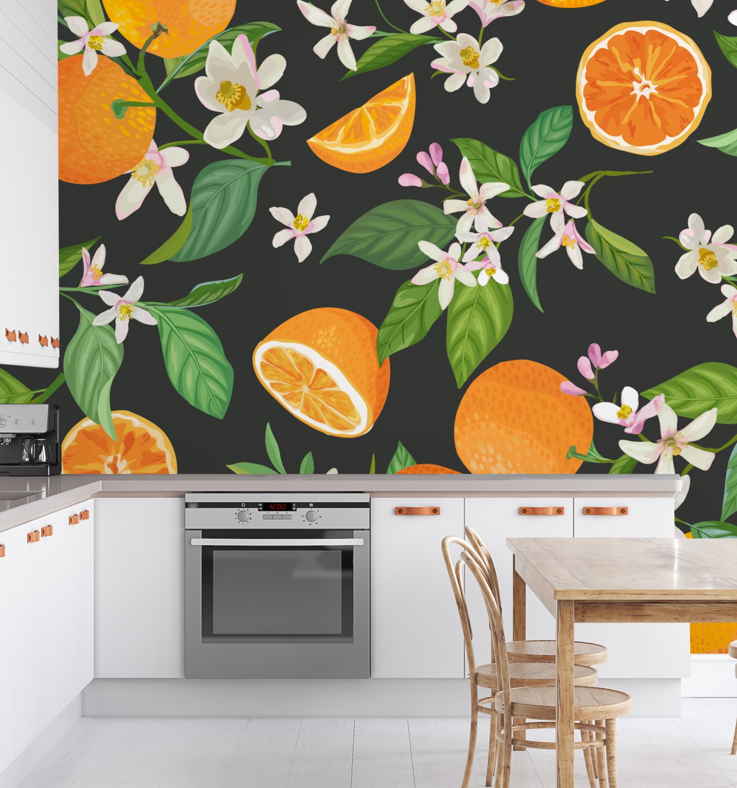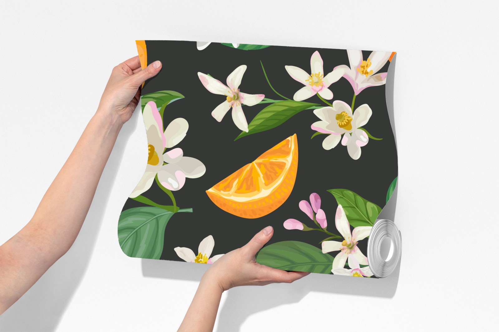 Lebhaftes Muster mit Orangen und Blüten bringt frische und moderne Atmosphäre in jeden Raum.