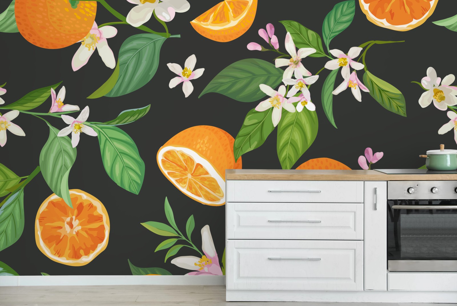 Lebhaftes Muster mit Orangen und Blüten bringt frische und moderne Atmosphäre in jeden Raum.MehrWeniger