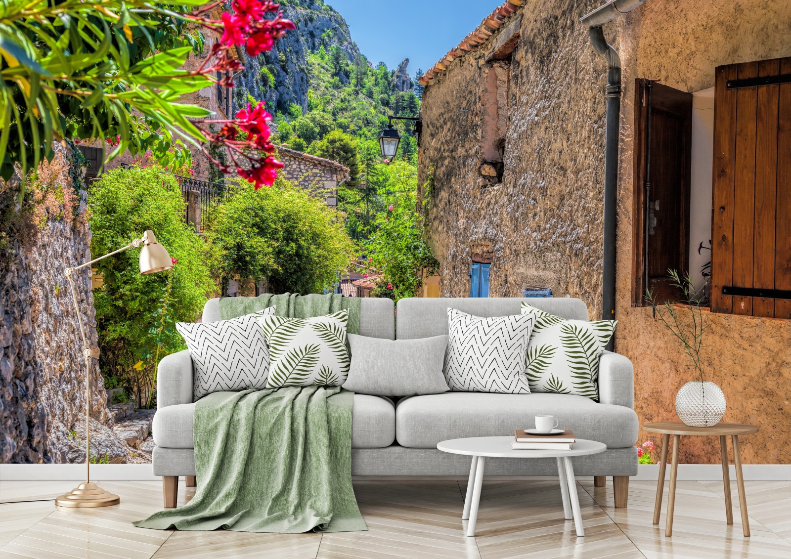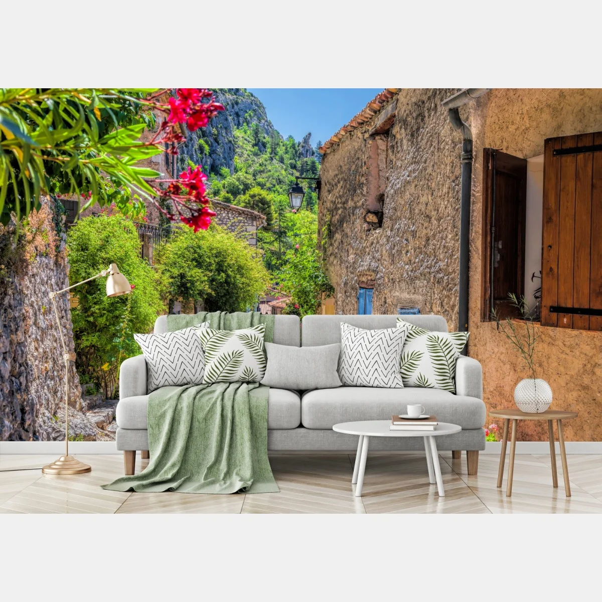 Bringen Sie den sonnenverwöhnten Charme von Moustiers Sainte Marie in Ihr Zuhause mit dieser lebendigen Szene aus Steinhäusern, blauen Fensterläden und blühenden Blumen.MehrWeniger