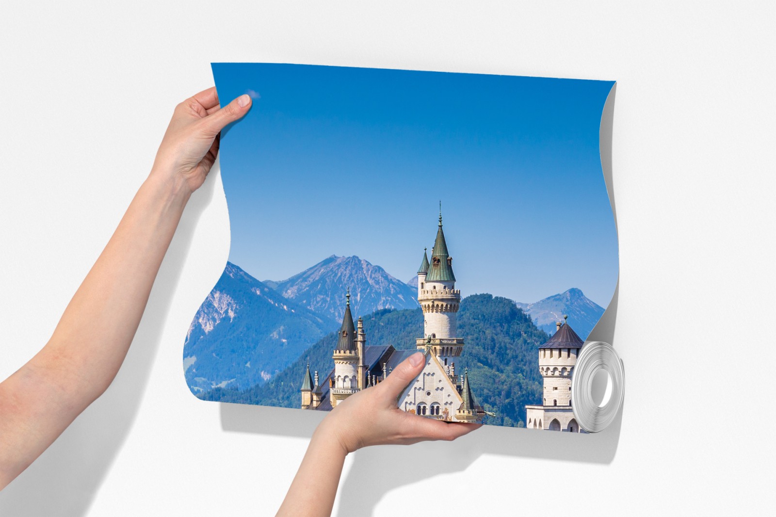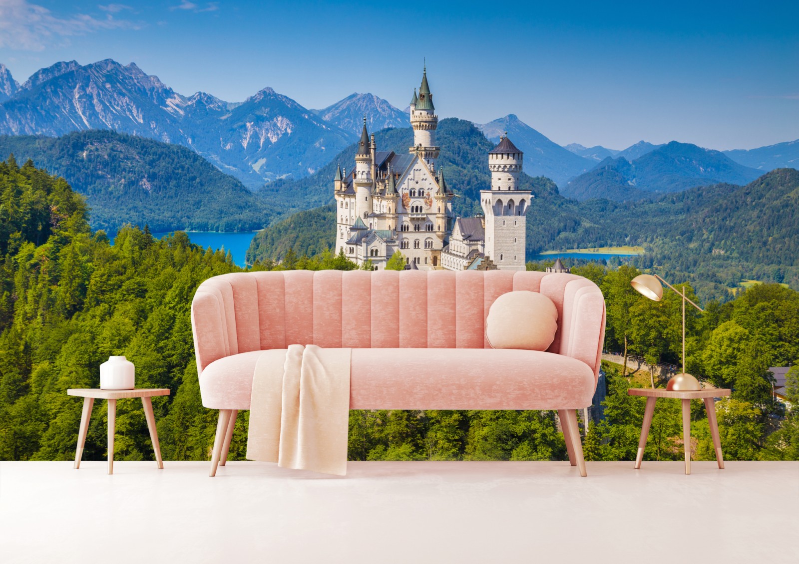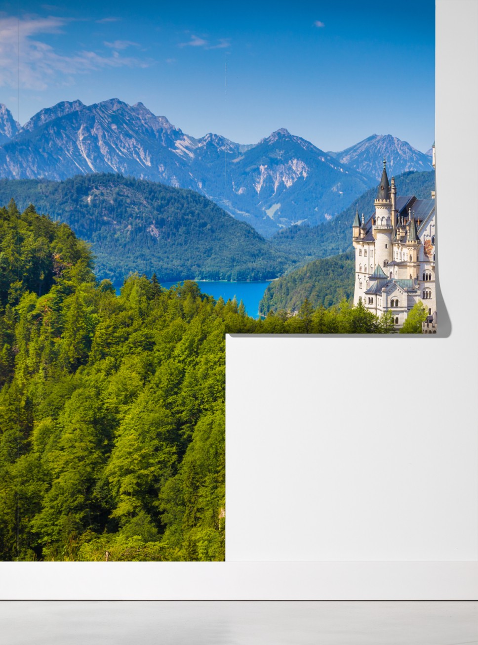 Bringen Sie märchenhaften Charme in Ihr Zuhause mit einem ikonischen Schloss vor Bergen, Wäldern und einem klaren See.