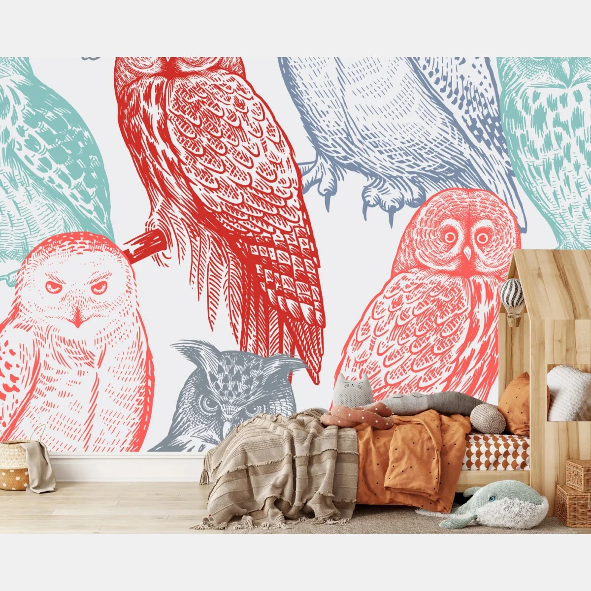 Handgezeichnete Eulen in lebendigen Farben bilden ein verspieltes, nahtloses Muster, ideal für Kinderzimmer und moderne Interieurs.MehrWeniger