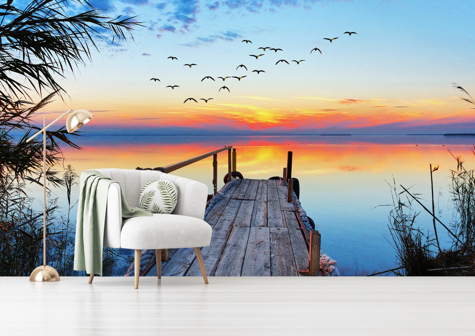 Fototapete Steg bei sonnenuntergang über ruhigem see