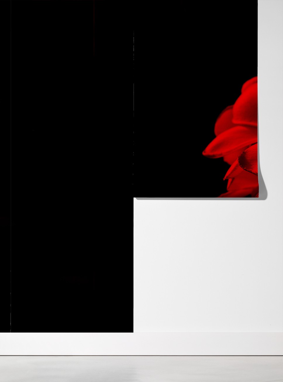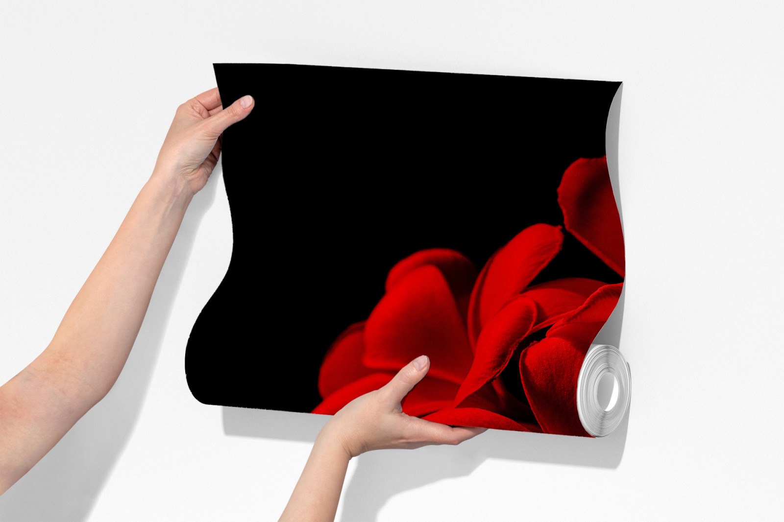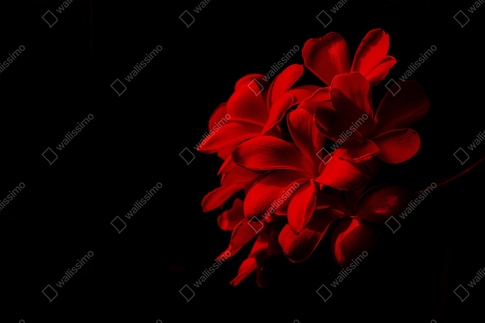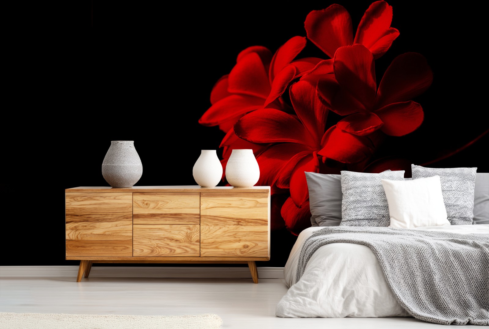 Verleihen Sie Ihrem Raum kraftvollen Kontrast und elegante Schlichtheit mit einer roten Plumeria vor tiefschwarzem Hintergrund.