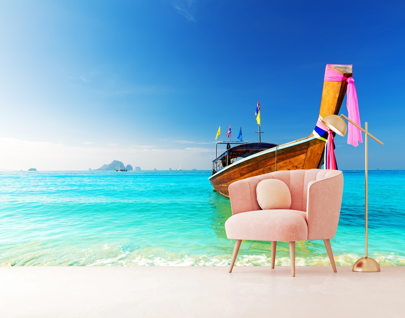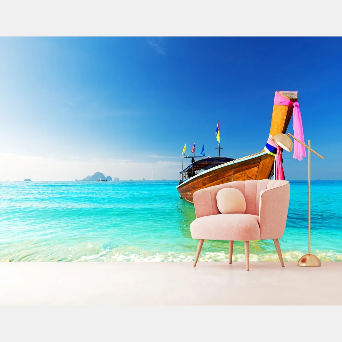 Fototapete Langheckboot am türkisfarbenen strand, Andamanensee