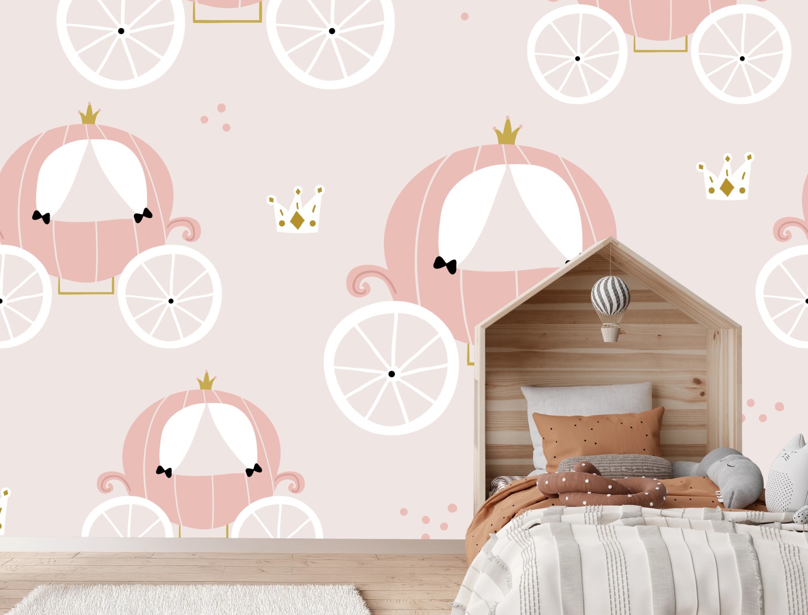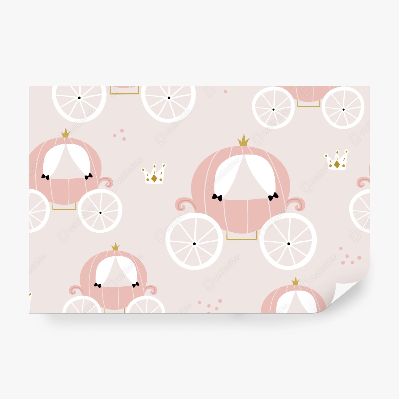 Charmantes pastellfarbenes Muster mit Prinzessinnenkutschen in sanften Rosatönen und goldenen Akzenten, ideal für ein verspieltes Kinderzimmer.MehrWeniger