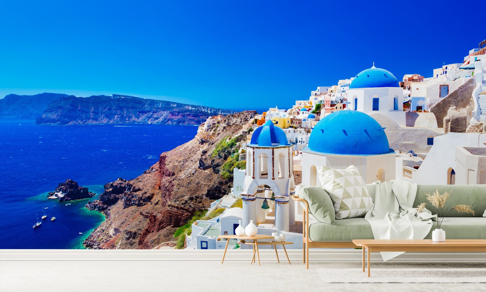 Bringen Sie das sonnige Flair von Santorini in Ihr Zuhause mit lebendigen blauen Kuppeln, weißer Architektur und funkelnden Meerblicken.MehrWeniger