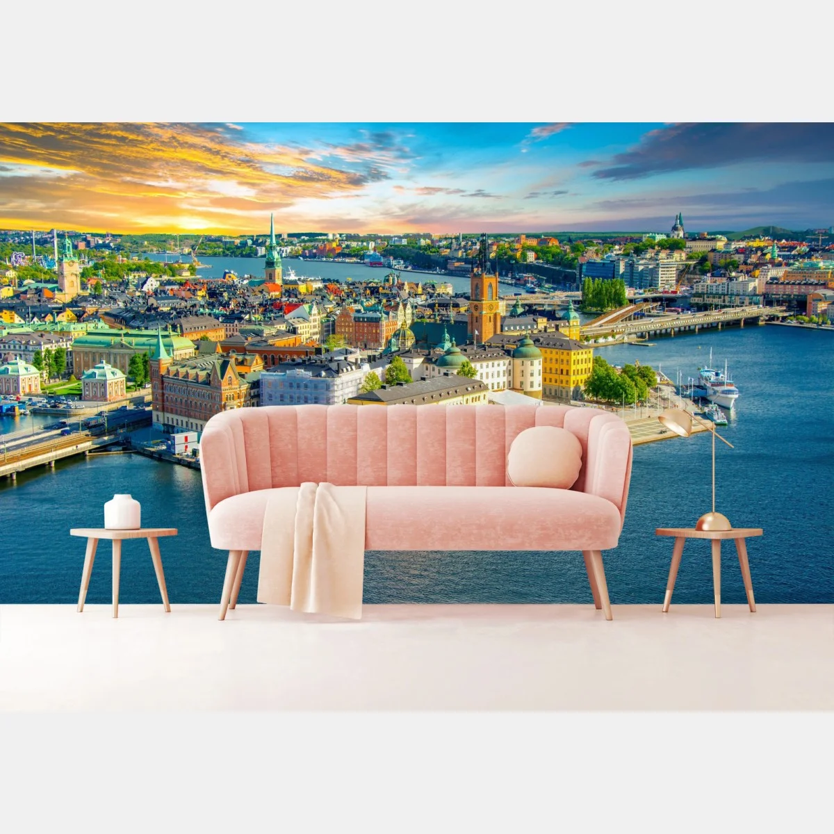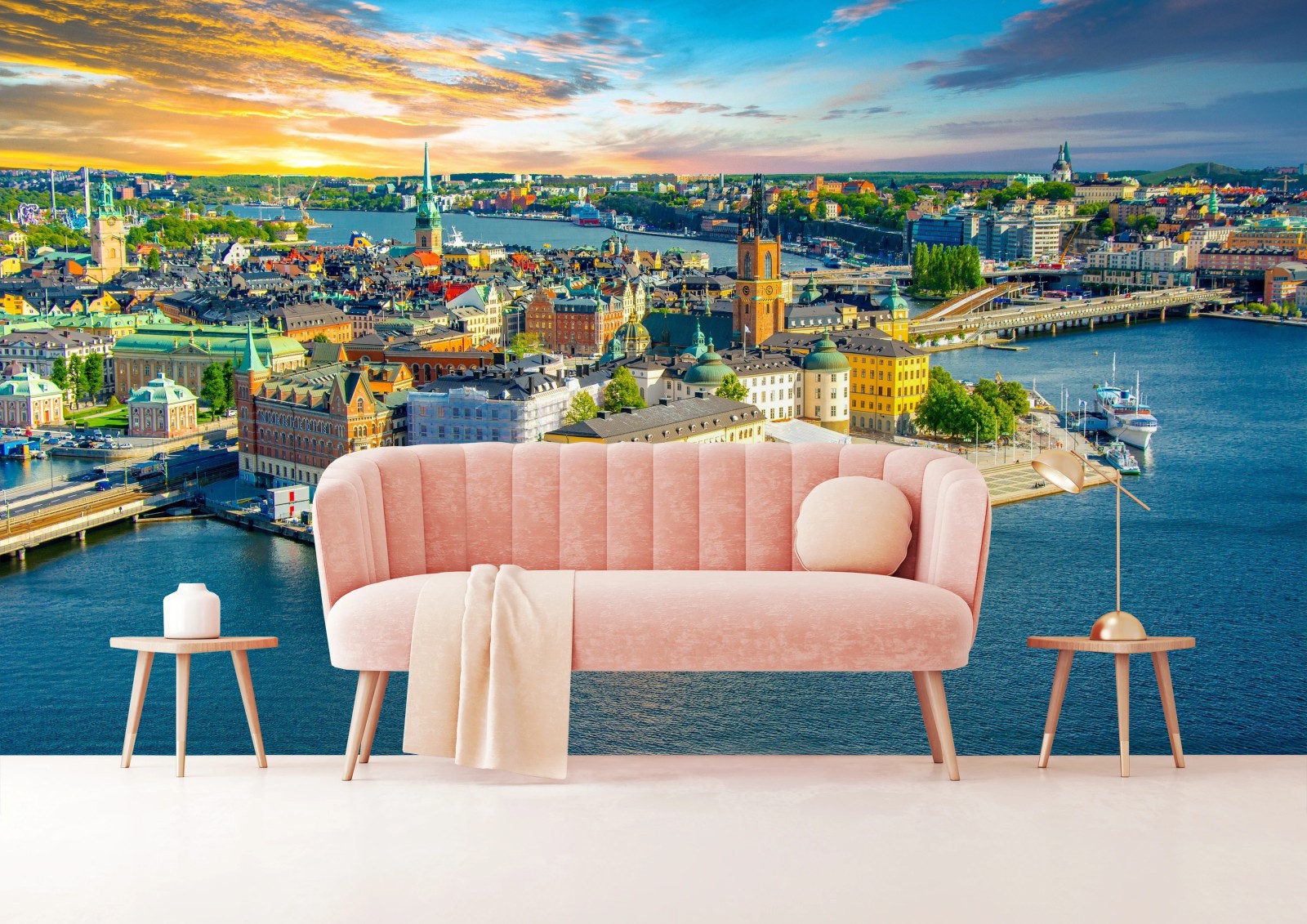 Fototapete Lebendige stadtansicht von Stockholm bei sonnenuntergang