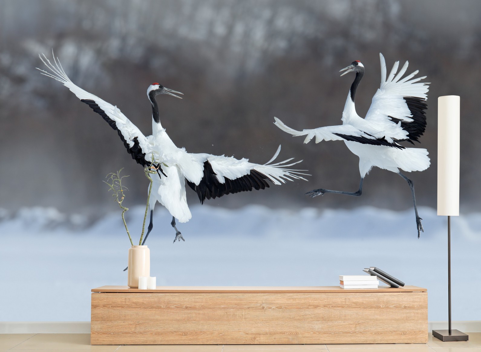 Fototapete Tanzende rotkronenkraniche im schnee, Hokkaido