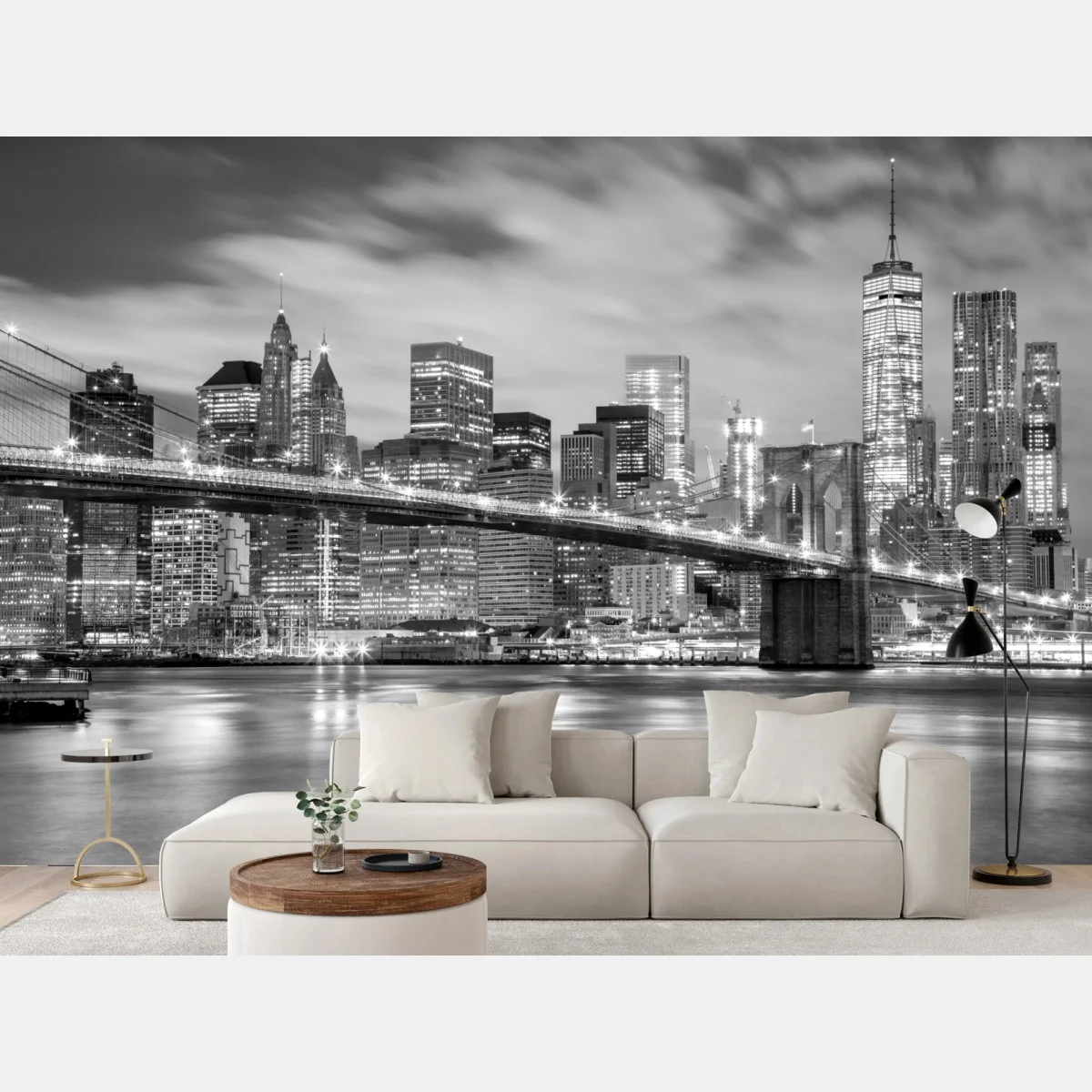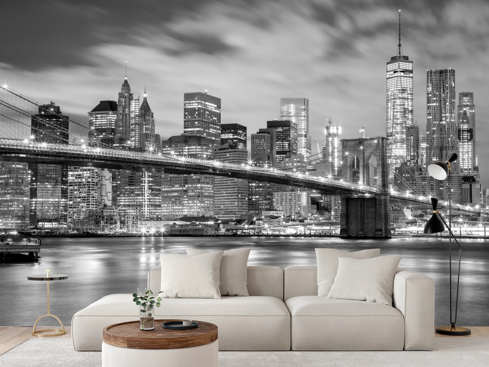 Bringen Sie urbane Eleganz in Ihr Zuhause mit dieser eindrucksvollen schwarzweißaufnahme der New Yorker Skyline und der Brooklyn Bridge.MehrWeniger