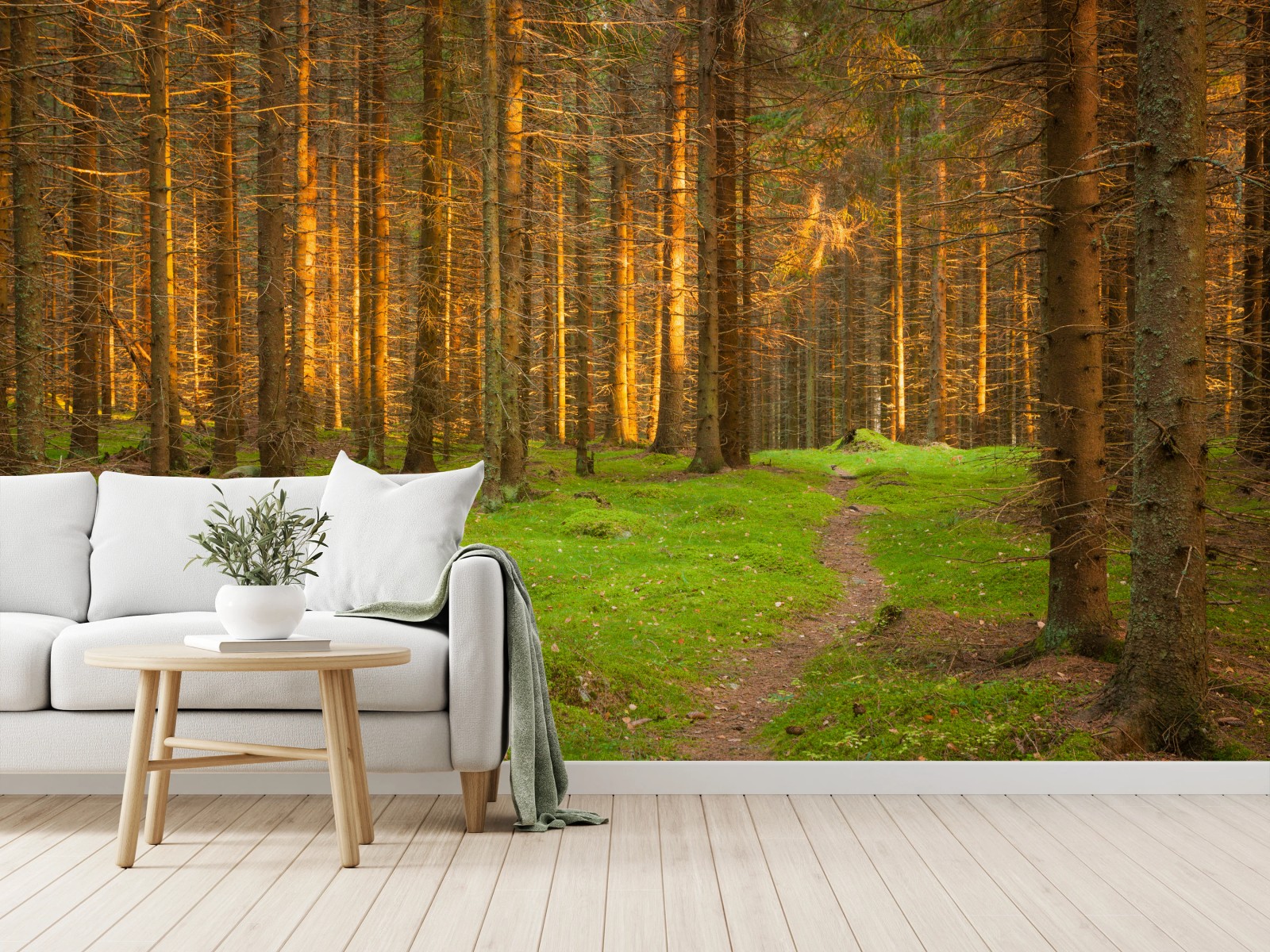 Fototapete Goldenes licht im moosbedeckten kiefernwald