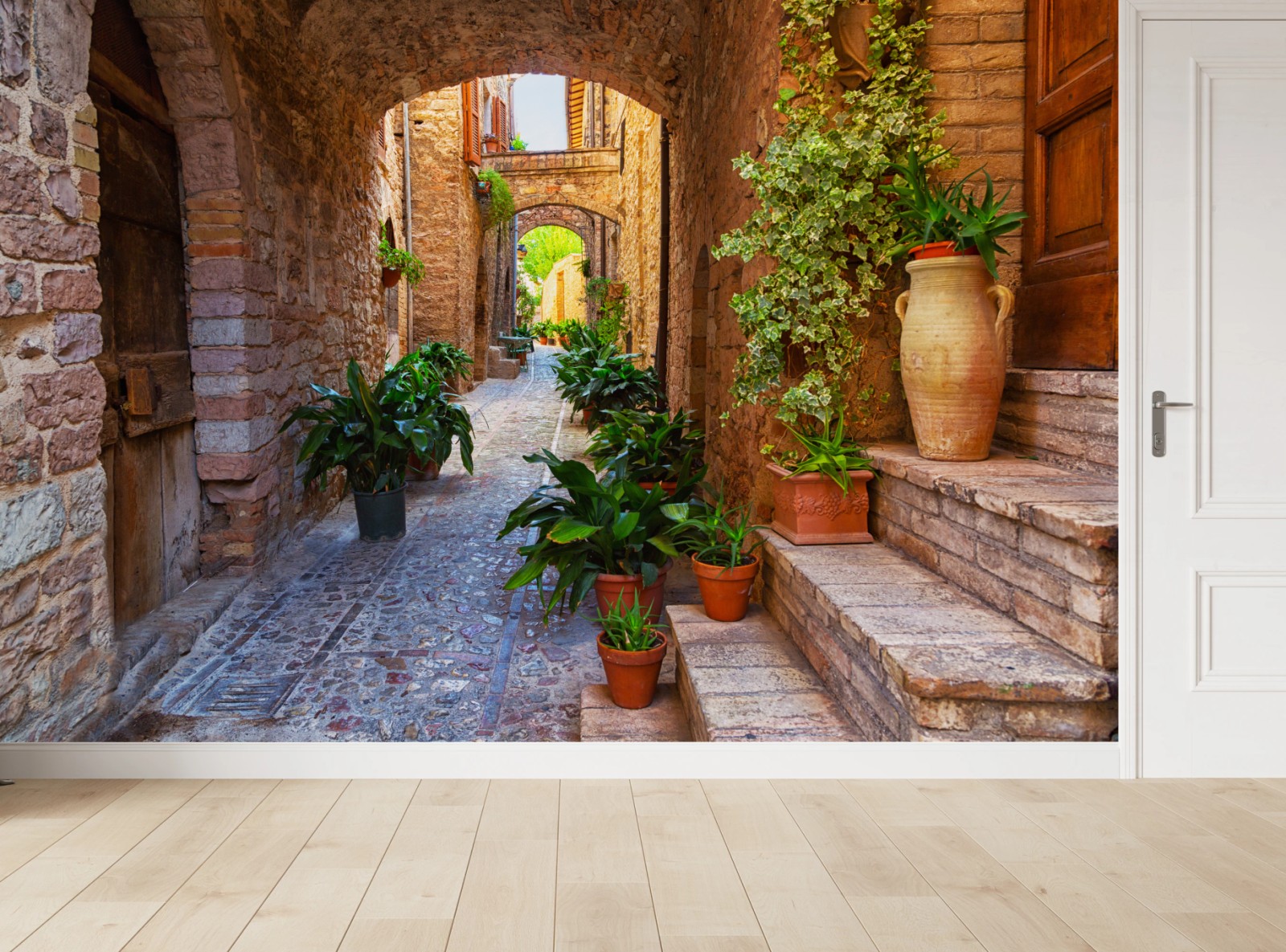 Fototapete Sonnige gasse mit blumentöpfen in Spello
