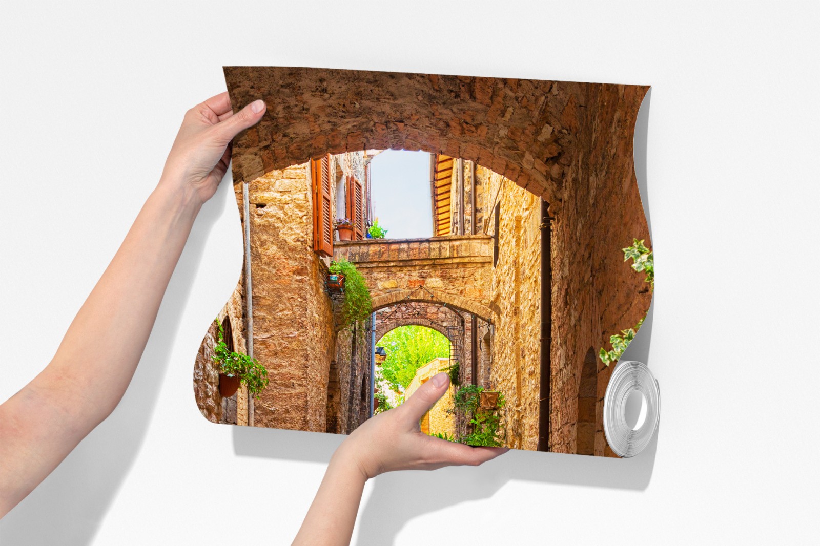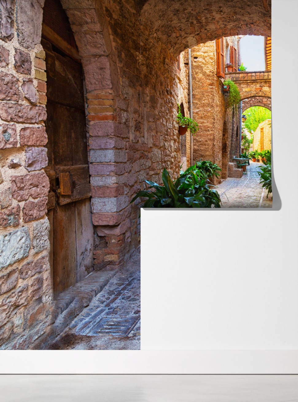 Bringen Sie den Charme einer sonnigen italienischen Gasse in Ihr Zuhause mit dieser warmen, pflanzengefüllten Szene aus Spello.