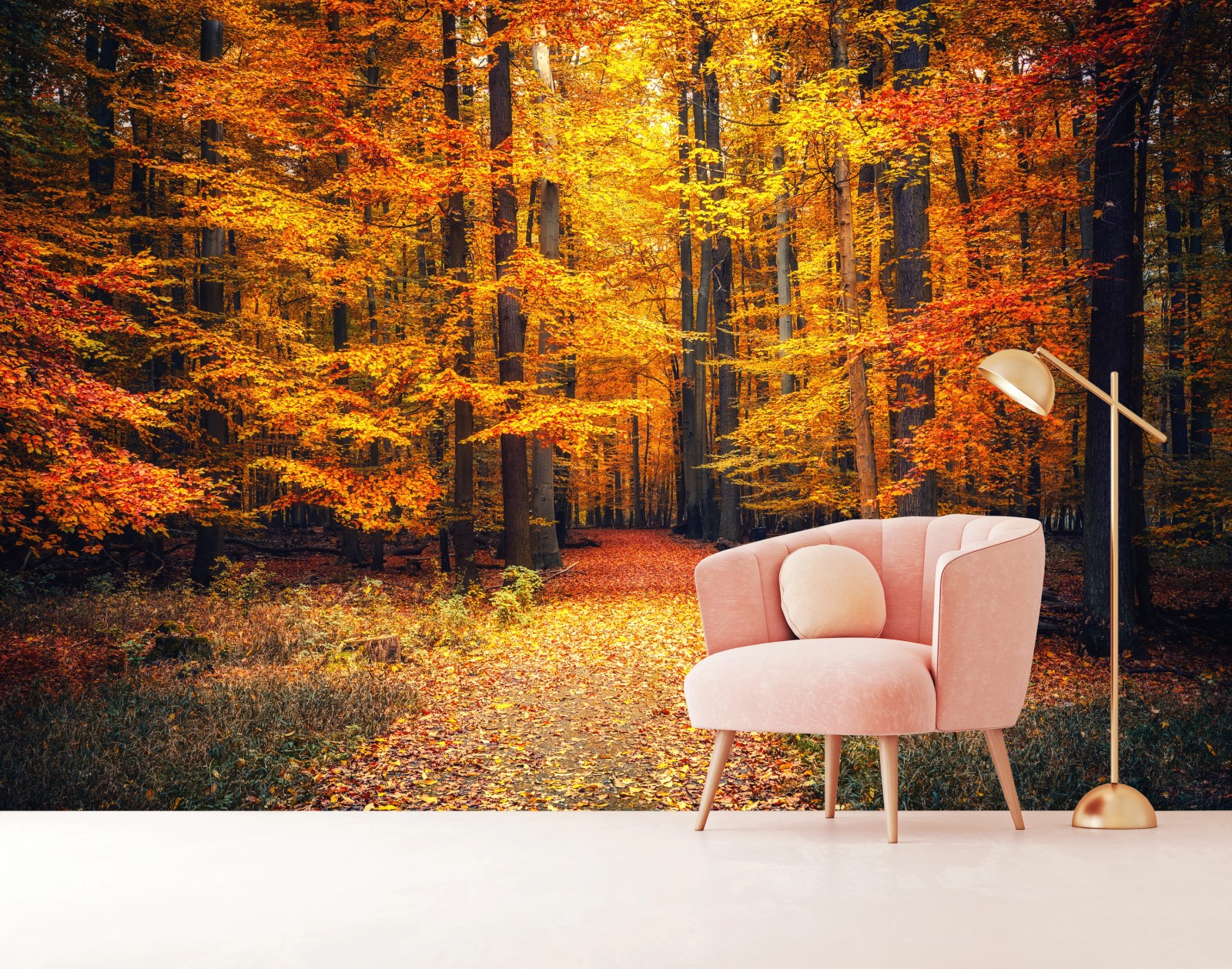 Fototapete Herbstlicher waldpfad mit goldenen blättern